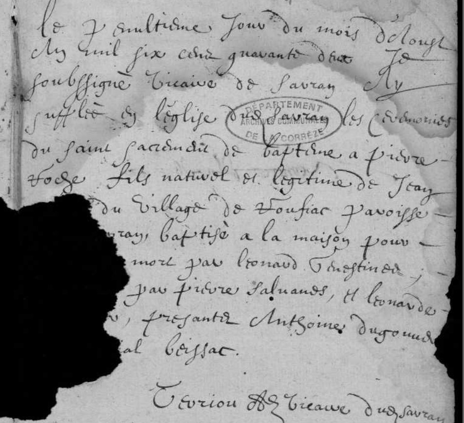 | Prénom | Pierre | | Nom de famille | Roche | Le 7 .... jour du mois d'aust de mil six cent quarante deux jay soussigné Vicaire de Sarran ay p.... à l'église de Sarran les cérémonies du saint ... de bapteme à Pierre Roche fils naturel et légitime de Jean.... du village de Roufiat paroisse ... arran baptisé à la maison pour ... ... par Léonard .... par Pierre Saluands, .. Léonarde.. .... Anthoine Dugo... | Naissance (plus...) | 7 août 1642 | Sarran, Corrèze, FRANCE (, Sarran, 19251, Corrèze, Nouvelle-Aquitaine, France) | | Baptême | 7 août 1642 | Sarran, Corrèze, FRANCE (, Sarran, 19251, Corrèze, Nouvelle-Aquitaine, France) |