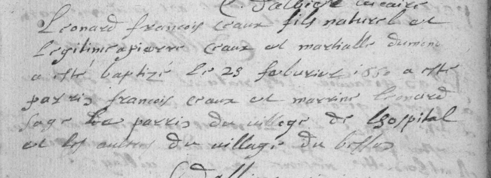 | Prénom | Léonard François | | Nom de famille | Ceaux | Léonard François Ceaux fils naturel et légitime à pierre ceaux et martialle Dumont a esté baptiséle 23 février 1660 a ... parrain françois ceaux et marraine léonarde? Sage ... ... du village de l'hospital et les autres du village du bos | Naissance (plus...) | 23 février 1660 | Corrèze, Corrèze, FRANCE (Bessou, Corrèze, 19062, Corrèze, Nouvelle-Aquitaine, France) | | Baptême | 23 février 1660 | Corrèze, Corrèze, FRANCE (, Corrèze, 19062, Corrèze, Nouvelle-Aquitaine, France) | Témoins au Bapteme/Naissance | Parrain François Ceaux Marraine Léonarde Sage
