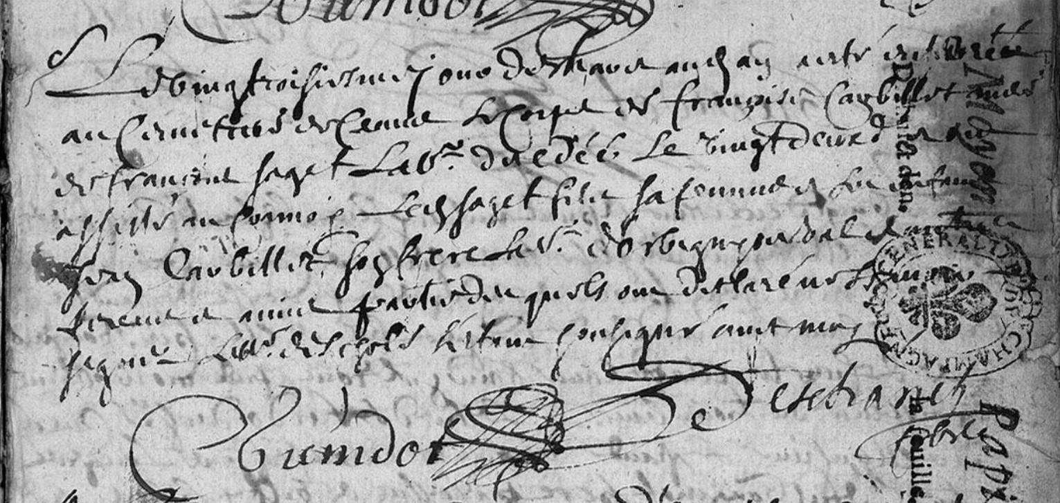 Le ving troifiesme Jour de mars au cf an a etre enterrée au Cimetiere de Ceant le corps de françoise Carbillet vve de françois faget Labr decedéé Le vingt deux d'et an affisté au convoy le cf faget fils fa femme et Les enfan... Jean Carbillet fon frere Labr d'orbigny au val et autre parent et ami ... ont declaré ne fcavoir signe ...