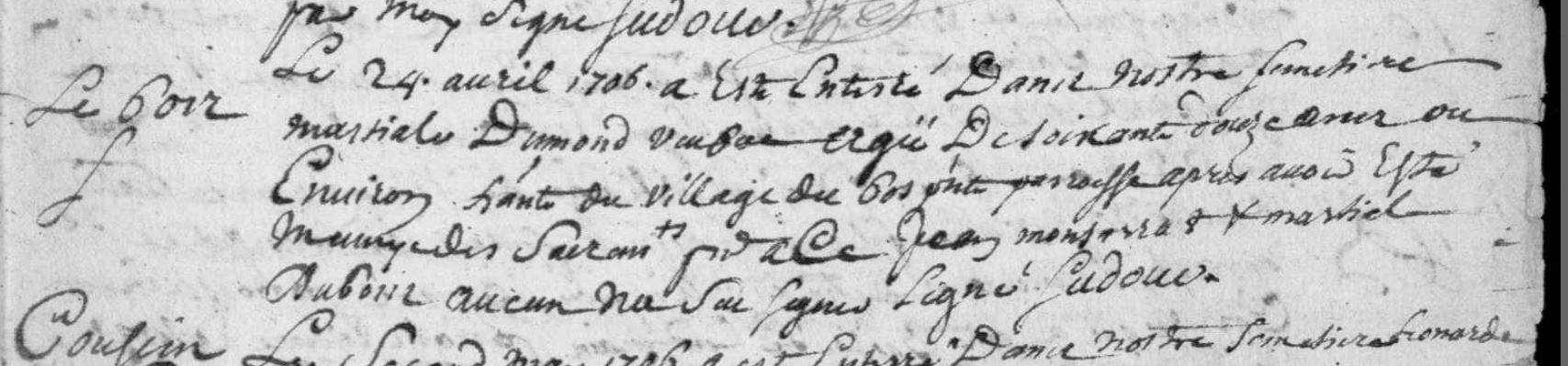 le 24 avril 1706 a été enterré dans notre cimetiere martiale Dumond veuve agée d'environ soixante douze ans ou environ habitante du village du Bos ... parroisse apres avoir esté muni des sacrements .. ..; jean monsar et ... martial dubom aucun j'a su signer