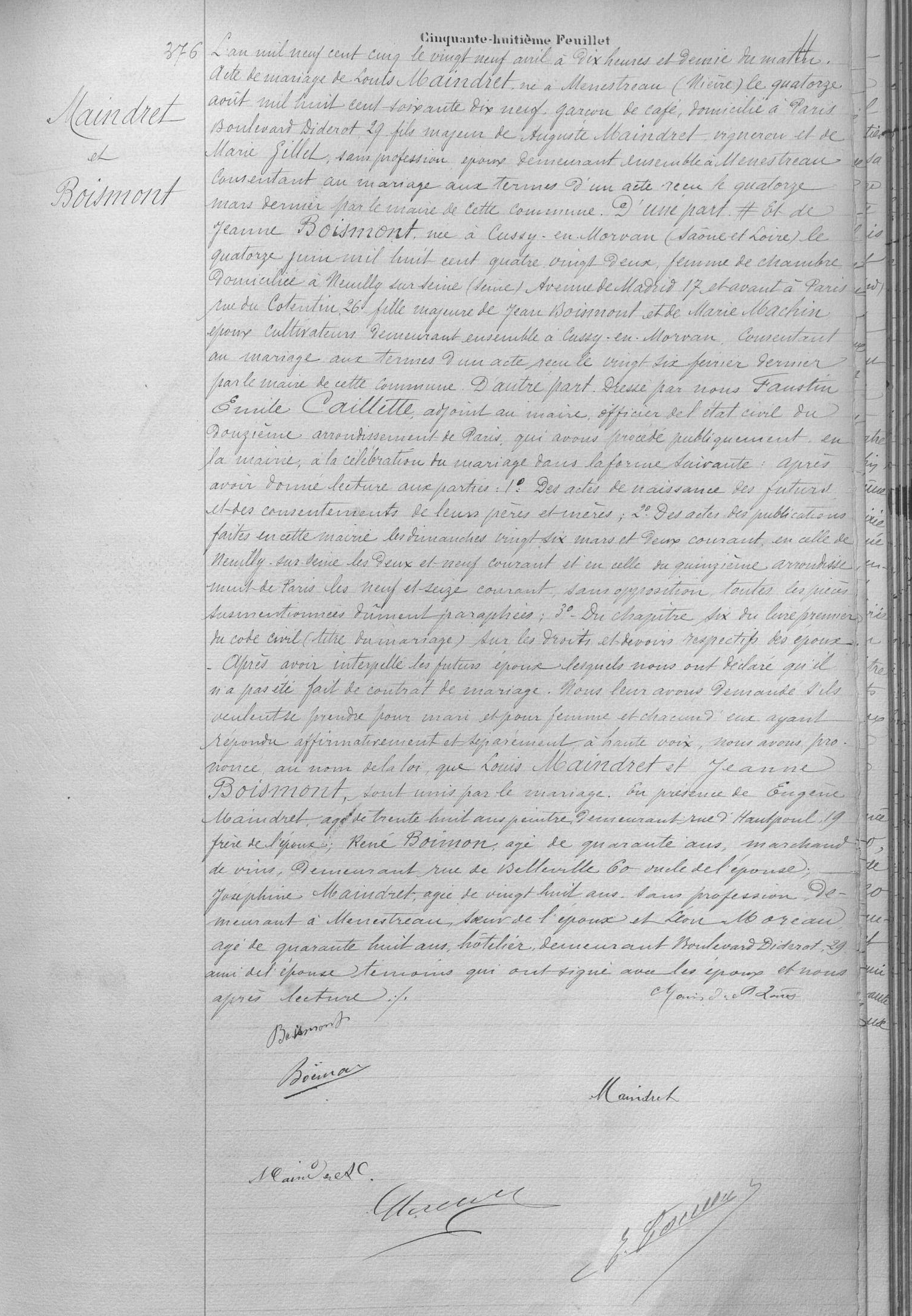 | Union | Jeanne Boismont (14 juin 1882 - 11 septembre 1957) | l'an mil neuf cent cinq le vingt neuf avril à dix heures et demie du matin acte de mariage de Louis Maindret, né à Menestreau (Nièvre) le quatorze août mil huit cent soixante dix neuf, garçon de café, domicilié à Paris Boulevard Diderot 29, fils majeur de Auguste Maindret, Vigneron et de Marie GIllet, sans profession, epoux demeurant à Menestrau consentant au mariage aux termes d'un acte reçu le quatorze mars dernier par le maire de cette commune, d'une part et de Jeanne Boismont née à Cussy-en-Morvan (Saône et Loire) le quatorze juin mil huit cent quatre vingt deux, femme de chambre domiciliée à Neuilly sur Seine (seine) avenue de madrid 17 et avant à Paris rue du cotentin 26, fille majeure de Jean Boismont et de Marie Machin epoux cultivateur demeurant ensemble à Cussy-en-Morvan. Consentant au mariage aux termes d'un acte reçu le vingt six février dernier par le maire de cette commune, D'autre part dresse par nous Faustin Emile Caillatte adjoint au maire officier de l'état civil du douzième arrondissement de Paris qui avons procédé publiquement en la mairie à la célébration du mariage dans la forme suivanten après avoir donné lecture aux parties 1° des actes de naissance des futurs et des consentements de leurs pères et mères. 2° des actes, des publications faites en cette mairie les dimanches vingt six mars et deux courant en celle de Neuilly sur seine, les deux et neuf courant et en celle du quinzième arrondisse- ment de Paris les neuf et seize courant, sans opposition toutes les pièces susmentionnées dûment paraphées, 3° du Chapitre six du livre premier du code civil du mariage, sur les droits et devoirs respectifs des époux Après avoir interpellé les futurs époux lesquels nous ont déclara qu'il n'a pas été fait de contrat de mariage. Nous leur avons demandé s'ils veulent se prendre pour mari et pour femme et chacun d'eux ayant répondu affirmativement et séparement à haute voix, nous avons pro- noncé, au nom de la loi que Louis Maindret et Jeanne Boismont, sont unis par le mariage, en présence de Eugène Maindret âgé de trente huit ans peintre demeurant rue d'Haupoul 19 frère de l'époux, René Boimon âgé de quarante ans, marchand de vins, demeurant rue de Belleville 60, oncle de l'épouse Josephine Maindret, agée de vingt huit ans sans profession, de- meurant à Menestrau, soeur de l'époux, et Léon Moreau agé de quarante huis ans, hôtelier, demeurant boulevard Diderot, 29 ami de l'époux, témoins qui ont signé avec les époux et nous après lecture signature Boismont, Boëmon, Maindret | Mariage (plus...) | 28 avril 1905 à l'âge de 26 ans | 12ème arrondissement, Paris, FRANCE (, Paris 12ème, 75012, Paris, Île-de-France, France) | Témoins au Mariage | Frère de l'époux Eugène Maindret (1866) Oncle de l'épouse René Boimont (11 novembre 1863) Soeur de l'époux Josephine Maindret (1877) Témoin Léon Moreau (1857)