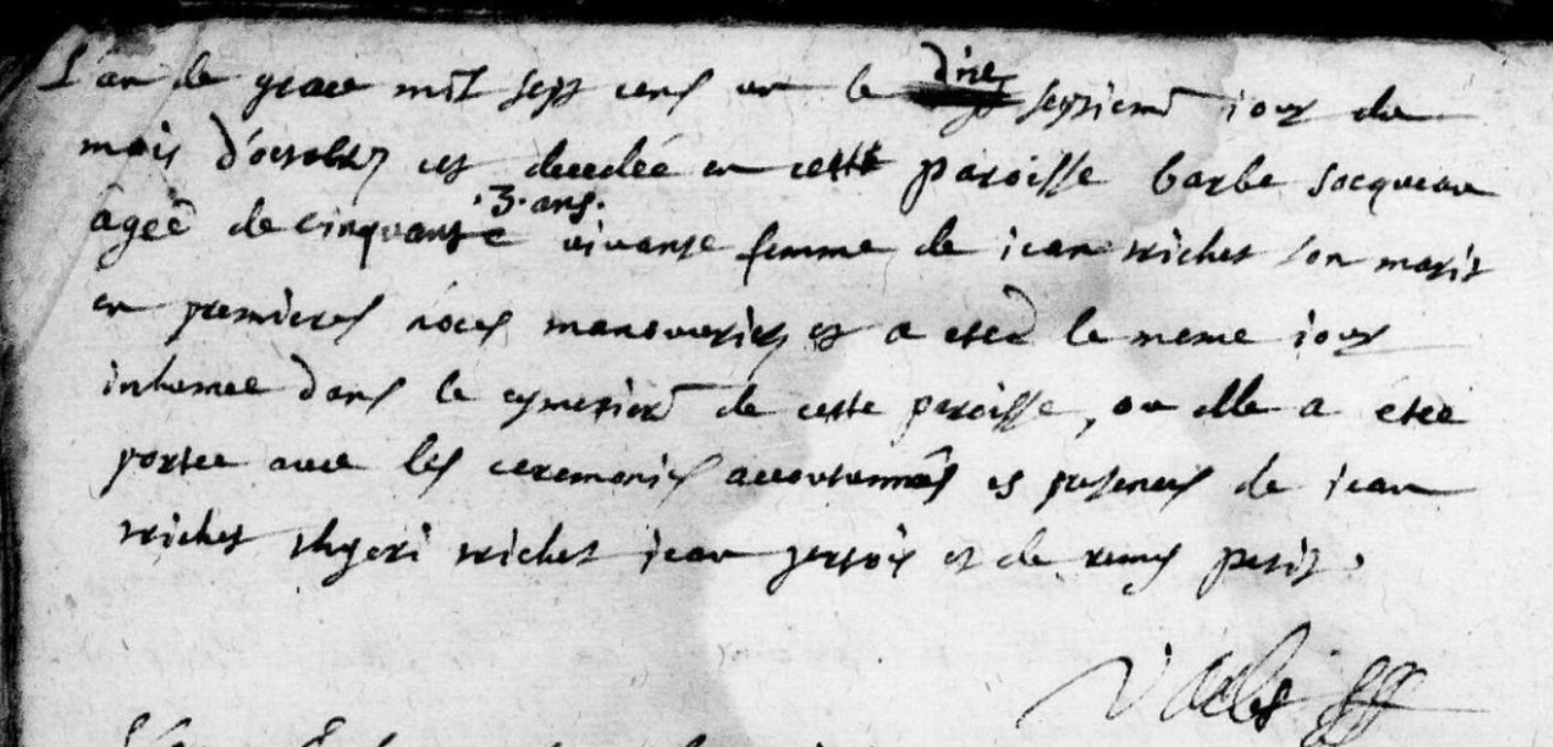 | Prénom | Barbe | | Nom de famille | Socqueau | | Naissance | 1648 | | l'an de grace mil sept cent un le dix septieme jour du mois d'octobre est décédée en cette paroisse barbe Socqeau âgée de cinquante 3 ans, vivante femme de Jean Trichet son mari en première noce manouvrier est a été le même jour inhumé dans le cimetiere de cette paroisse, ou elle a étée ... porter. avec les céromonies ... et ... de Jean Trichet, michel Jean ... et de ... petit? | Décès (plus...) | 17 octobre 1701 à l'âge de 53 ans | Saint-Loup-en-Champagne, Ardennes, FRANCE (, Saint-Loup-en-Champagne, 08386, , Grand-Est, Franceai) |