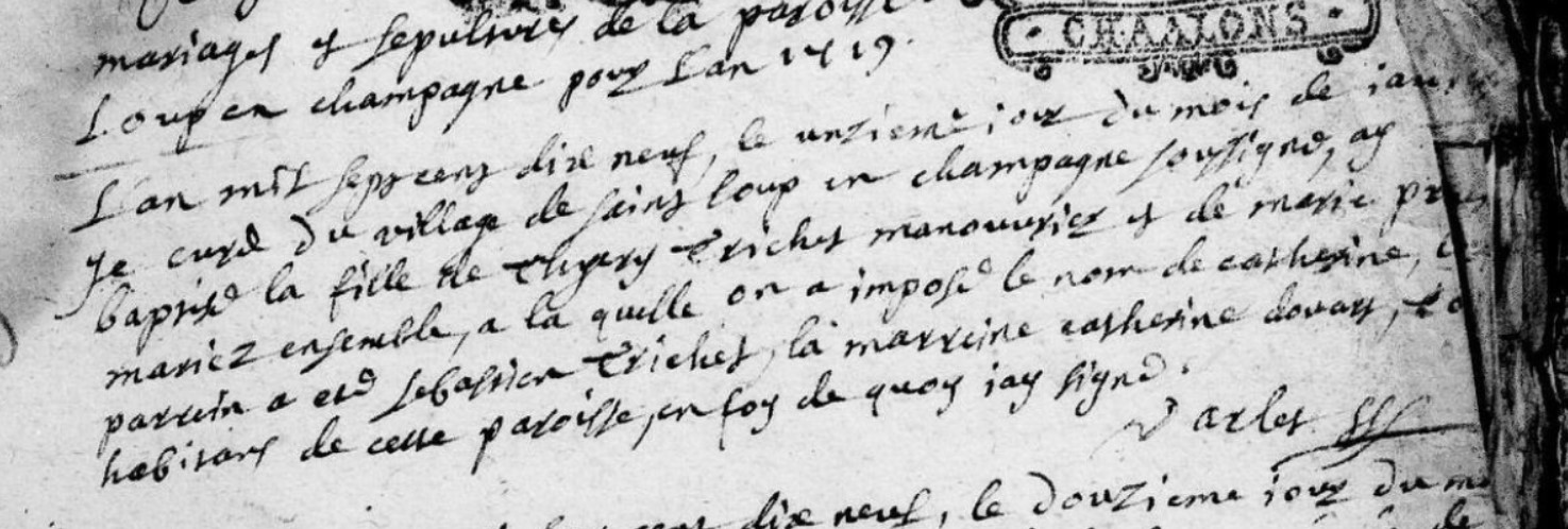 | Prénom | Catherine | | Nom de famille | Trichet | l'an mil sept cent dix neuf le onzieme jour du mois de janvier je curé du village de saint loup en champagne, soussigné ay baptisé la fille de Thierry Trichet manouvrier et de Marie Prieuse mariés ensemble à la quelle on a imposé le nom de Catherine, le parrain a été Sebastien Trichet, la Marraine Catherine Douay, tous habitans de cette paroisse en foy de quoy iay signé Signature : Varlet | Naissance (plus...) | 11 janvier 1719 | Saint-Loup-en-Champagne, Ardennes, FRANCE (, Saint-Loup-en-Champagne, 08386, , Grand-Est, Franceai) | | Baptême | 11 janvier 1719 | Saint-Loup-en-Champagne, Ardennes, FRANCE (, Saint-Loup-en-Champagne, 08386, , Grand-Est, Franceai) |
