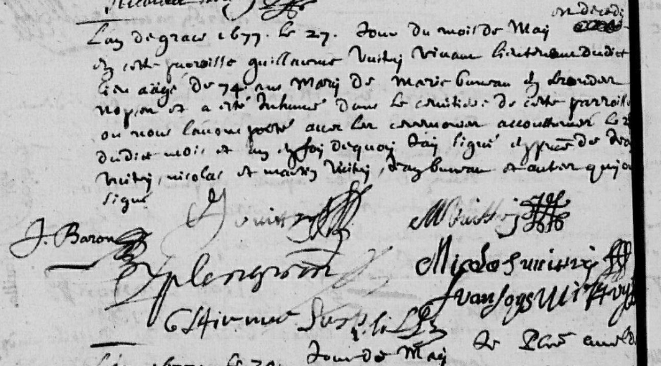 l'an de grace 1677 le 27 jour du mois de May, .... paroisse Guillaume Vuitry Vivant... dudit ... de 74 ans inhumé dans le cimetiere de cette paroisse ou nous l'avons porté avec les cérémonies accoutumées le... dudit mos et en foy de quoy j'ay signé ... du ... vitry, Nicolas et m... vitry, ...y buneau et autres qui ont signé