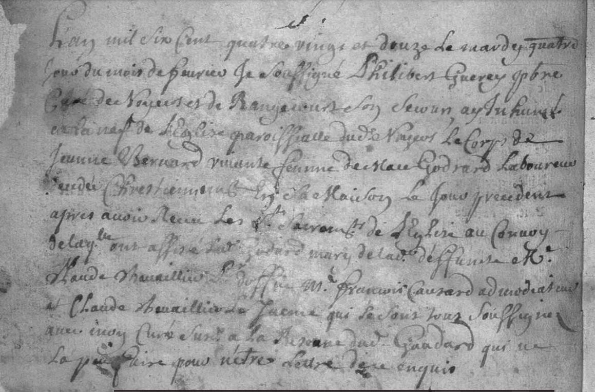| Prénom | Jeanne | | Nom de famille | Bernard | | Naissance | 1640 | | L'an mil six cent quatre vingt et douze le mardy quatre jour du mois de février je soussigné Philiibert Guerey prêtre curé de Noyers et de Ranhe... son ... ay Inhumé en la nef de l'église paroissialle dudit Noyers le corps de Jeanne Bernard vivante femme de Mace Godard laboureur décédée chrestiennement en sa maison le jour précédent après avoir reçu les saints sacrements de l'église au convoy de ... ont assisté ... Godard mari de laditte deffunte Me Claude Banvillier qui se sont tous soussigné avec moy curé ... à la ... . ... Goudard qui ne le peu faire pour n'être ... de ce requis | Décès (plus...) | 3 février 1692 à l'âge de 52 ans | Noyers, Haute-Marne, FRANCE (, Noyers, 52358, Haute Marne, Grand-Est, France) | | Sépulture | 4 février 1692 | Noyers, Haute-Marne, FRANCE (, Noyers, 52358, Haute Marne, Grand-Est, France) |