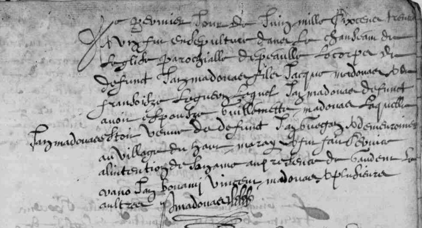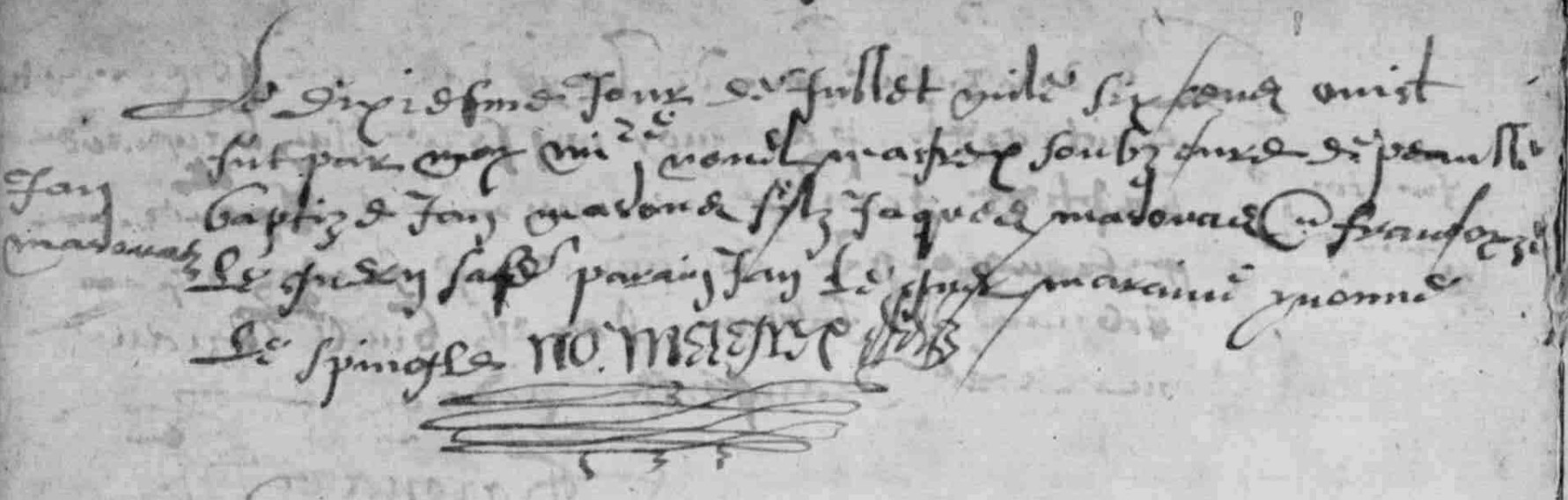 | Prénom | Jean | | Nom de famille | Madouas | le dixieme jour de juillet mil six cent huit fut ... par moy .. ... .. ... ... baptisé Jean Madouas fils de Jacques Madouas et de Françoise le Guern parrain Jan le Guern marraine Yvonne le Spingle | Naissance (plus...) | 10 juillet 1608 | Péaule, Morbihan, FRANCE (, Péaule, 56153, Morbihan, Bretagne, France) | | Baptême | 10 juillet 1608 | Péaule, Morbihan, FRANCE (, Péaule, 56153, Morbihan, Bretagne, France) | Témoins au Bapteme/Naissance | Parrain Jean l'ainé Le Guern Marraine Yvonne le Spingle