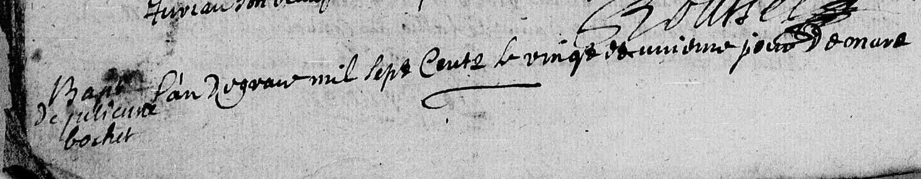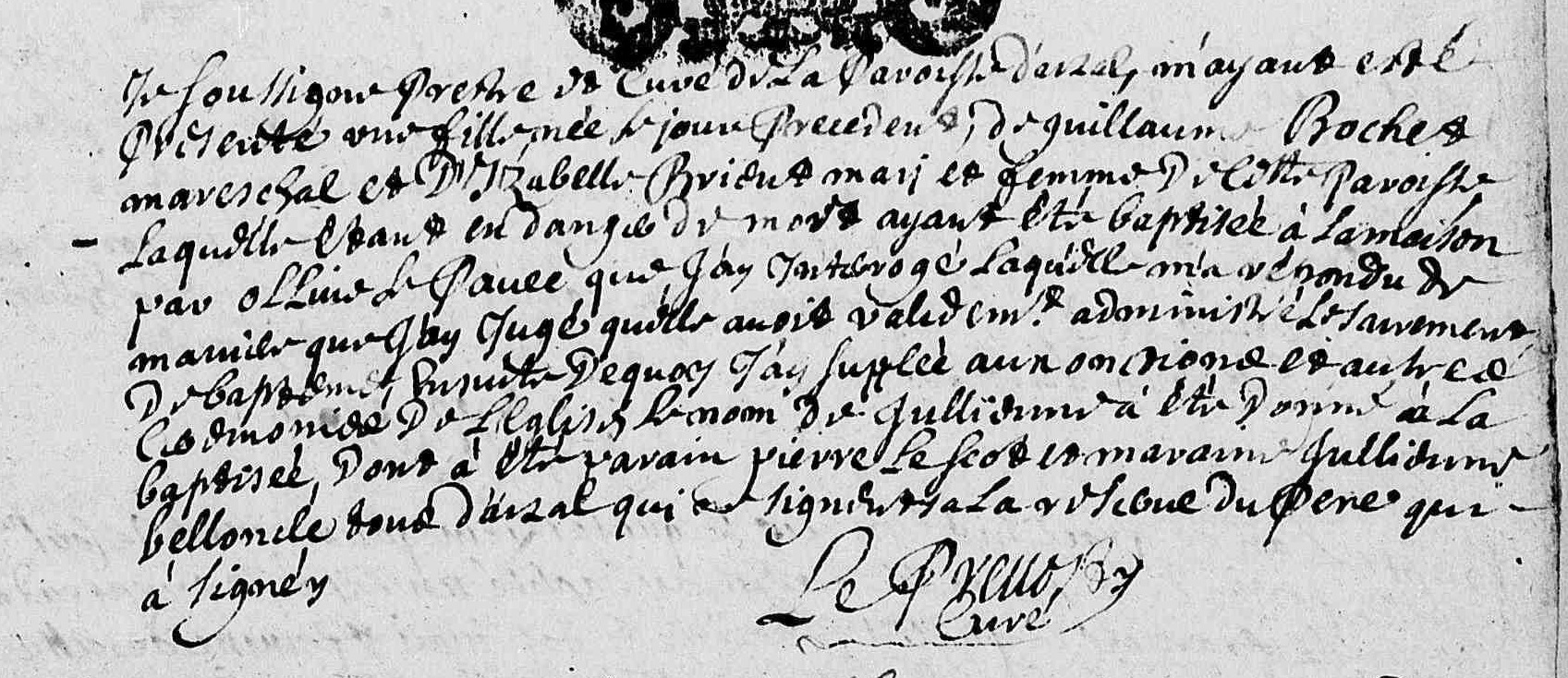 | Prénom | Julienne | | Nom de famille | Bochet | l'an de grace mil sept cent le vingt deuxieme ? jour de mars je soussigne pretre et cure de la paroisse d'arzal m'ayant esté présenté une fille née le jour précédent de Guillaume Bochet mareschal et d'Izabelle Brient mari et femme de cette paroisse laquelle étant en danger de mort ayant été baptisée à la maisonpar Ollive le Pance que j'ay interrogé laquelle m'a répondu de maniere que j'ay jugé qu'elle avait validement administré les sacrements du bapteme et ensuite de quoy j'ay supplée aux ... et autres ... de l'église le nom de Julienne a été donné à la baptisées dont a été parrain Pierre le Scot et marraine Jullienne Belloncle d... d'Arzal qui ... signent à la .. du pere qui .. à signé | Naissance (plus...) | 21 mars 1700 | Arzal, Morbihan, FRANCE (, Arzal, 56004, Morbihan, Bretagne, France) | | Baptême | 22 mars 1700 | Arzal, Morbihan, FRANCE (, Arzal, 56004, Morbihan, Bretagne, France) |