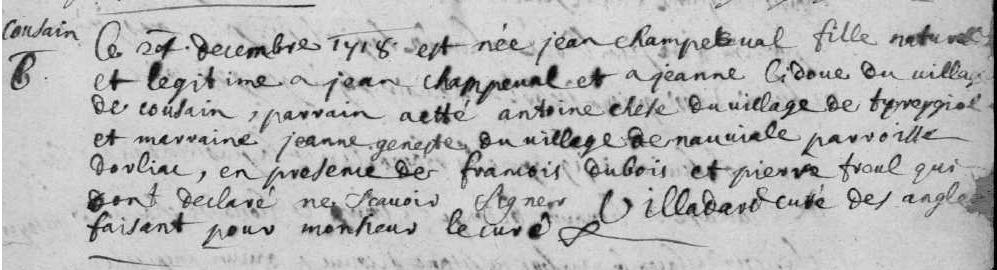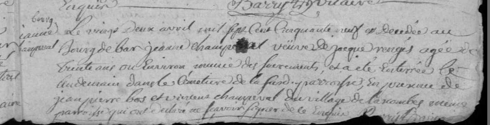 | Prénom | Jeanne | | Nom de famille | Champeval | | Naissance | 21 décembre 1718 | Bar, Corrèze, FRANCE (Cousain, Bar, 19016, Corrèze, Nouvelle-Aquitaine, France) | | Baptême | 21 décembre 1718 | Bar, Corrèze, FRANCE (Cousain, Bar, 19016, Corrèze, Nouvelle-Aquitaine, France) | le vingt deux avril mil sept cent cinquante neuf est décédé au bourg de ... jeanne champeval veuve de Jacques renges agée de trente ans ou environ munie des sacrements et a été enterrée le lendemain dans le cimetierre de la susdite paroisse en présence de jean pierre bos et vincent champeval du village de lascombes meme paroisse qui ont déclaré ne savoir signer de ce requis | Décès (plus...) | 22 avril 1759 à l'âge de 41 ans | Bar, Corrèze, FRANCE (, Bar, 19016, Corrèze, Nouvelle-Aquitaine, France) | Témoins Décès | Témoin Jean-Pierre Bos Témoin Vincent Champeval