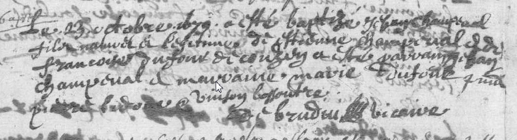 | Notes | Tables des mariages - BAR => mariages possibles : - 17.09.1679 Champeval Jean et Lidove Anne - 11.05.1699 Champeval Jean, originaire de Bar (19016), au lieu-dit Cousin Lidove Anne, originaire de Saint Salvadour (19240) - 23.02.1705 Champeval Jean et Lidove Anne A priori plutot 11/05/1699 ? |