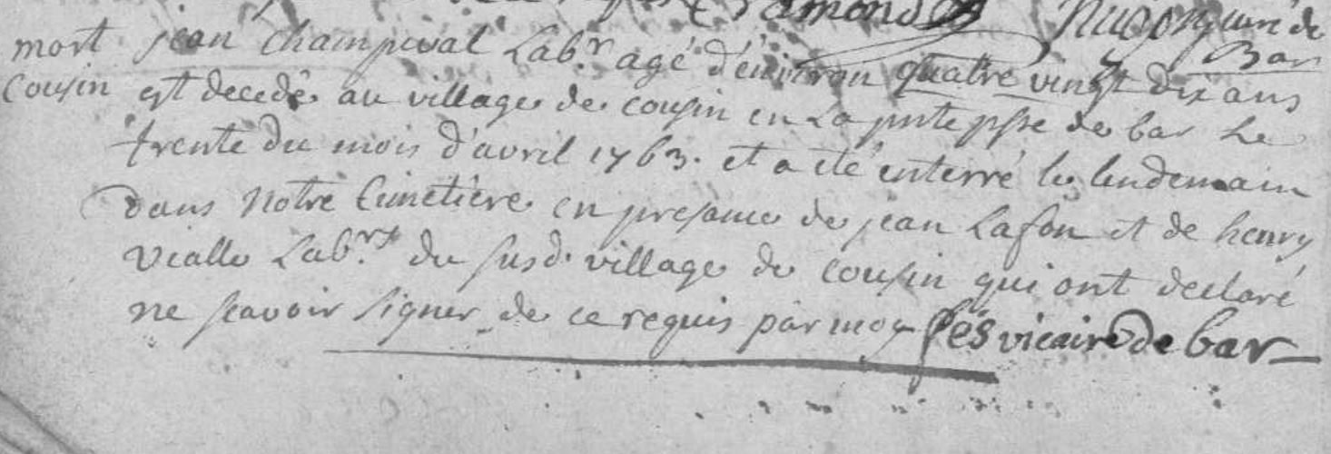 | Prénom | Jean | | Nom de famille | Champeval | | Profession | Brassier | Le 23 octobre 1679 à été baptisé Jean Champeval fils naturel et légitime de Etienne Champeval et de Françoise Dufour ... a été parrain Jean Champeval et marraine marie Dufour | Naissance (plus...) | 23 octobre 1679 | Bar, Corrèze, FRANCE (, Bar, 19016, Corrèze, Nouvelle-Aquitaine, France) | | Baptême | 23 octobre 1679 | Bar, Corrèze, FRANCE (, Bar, 19016, Corrèze, Nouvelle-Aquitaine, France) | | Décès | 30 avril 1763 à l'âge de 84 ans | Bar, Corrèze, FRANCE (, Bar, 19016, Corrèze, Nouvelle-Aquitaine, France) |