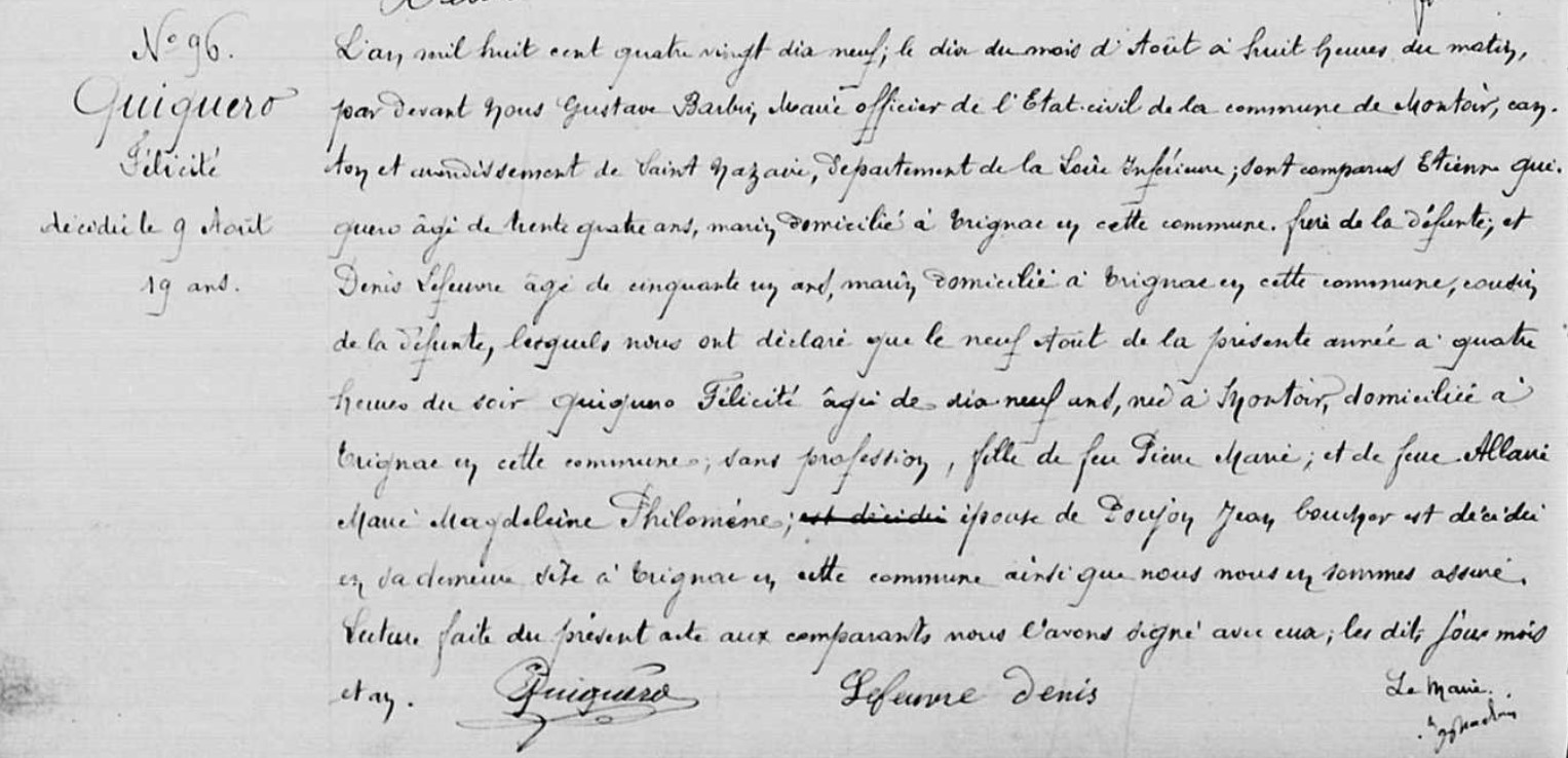 | L'an mil huit cent quatre vingt dix neuf, le dix du mois d'Août à huit heures du matin, par devant nous Gustave Barbier, Maire officier de l'Etat-civil de la commune de Montoir, canton et arrondissement de Saint-Nazaire, département de la Loire Inférieure; sont comparus Etienne Guiquero âgé de trente quatre ans, marin, domicilié à Trignac en cette commune, frère de la défunte et Denis Lefeuvre âgé de cinquante un ans marin, domicilié à Trignac en cette commune, cousin de la défunte, lesquels nous ont déclaré que le neuf Août de la présente année à quatre heures du soir, Guiquero Félicité âgée de dix neuf ans, née à Montoir, domicilié à Trignac en cette commune, sans profession, fille de feu Pierre Marie; et de feue Allaire Marie Magdeleine Philomène; épouse de Poujon Jean, boucher est décédée en sa demeure sise à Trignac en cette commune ainsi que nous nous en sommes assuré. Lecture faite du présent acte aux comparants nous l'avons signé avec eux, les dits jour mois et an | Décès (plus...) | 9 août 1899 à l'âge de 20 ans | Montoir-de-Bretagne, Loire-Atlantique, FRANCE (Trignac, Montoir-de-Bretagne, 44103, Loire Atlantique, Pays de la Loire, France) | Témoins Décès | Déclarant Etienne Guiquéro (1865) Déclarant Denis Lefeuvre (1848)