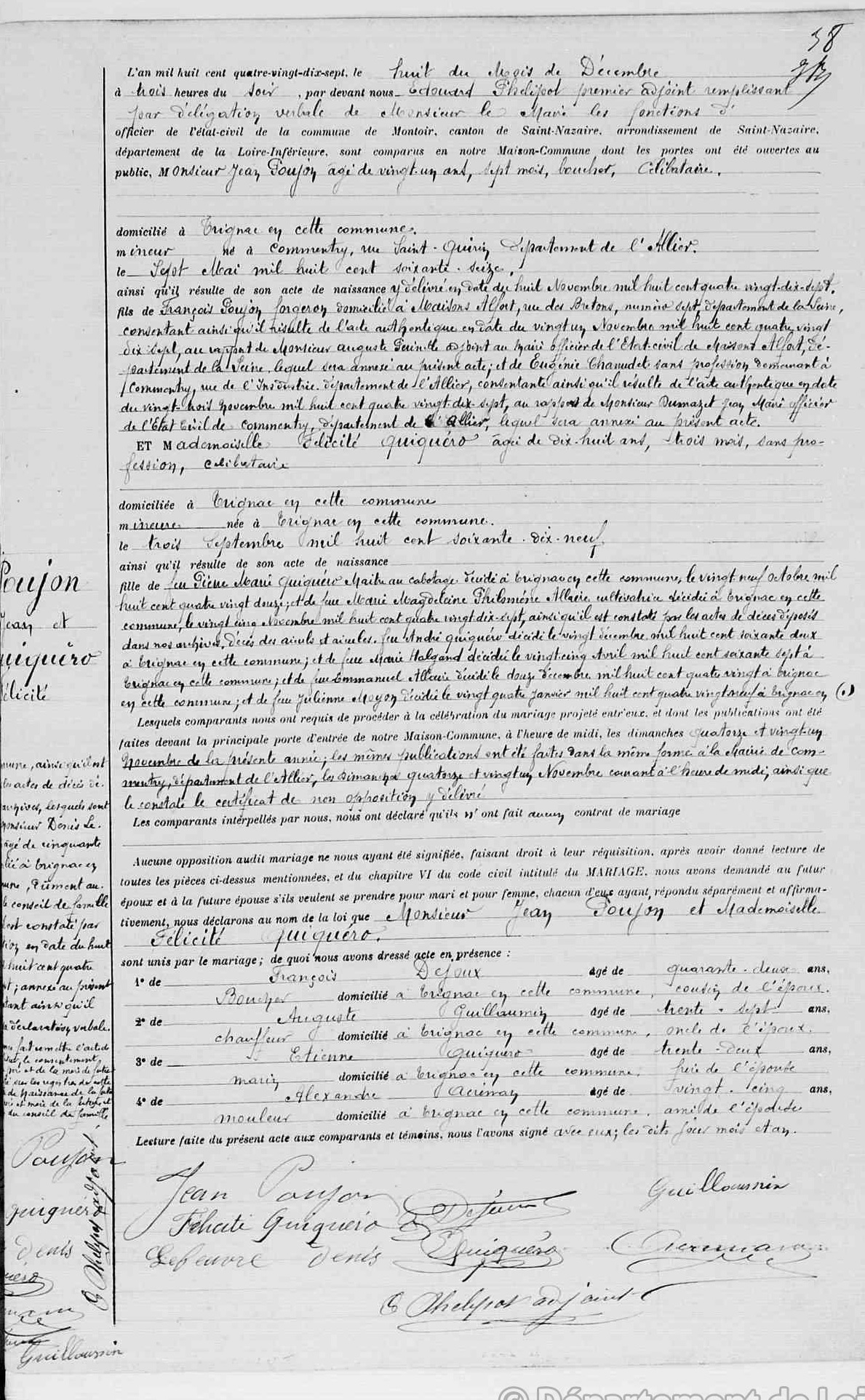 | Union | Jean Poujhon (7 mai 1876 - 5 mars 1914) | Date de mariage et épouse indiqués en marge de l'acte de naissance de Poujon Jean l'an mil huit cent quatre-vingt-dix-sept, le huit du mois de Décembre à trois heures du soir, par devant nous, Edouard Philipot, premier adjoint, remplissant par délégation, verbale de Monsieur le Maire des fonctions d'officier de l'état civil de la commune de Montoir, canton de Saint-Nazaire, arrondissement de Saint-Nazaire, département de la Loire-Inférieure, sont comparus en notre Maison-Commune dont les portes ont été ouvertes au Public, Monsieur Jean Poujon, âgé de vingt-un ans, sept mois, boucher, célibataire domicilié à Trignac en cette commune, mineur, né à Commentry rue Saint Quirin, département de l'allier le sept mai mil huit cent soixante-seize, ainsi qu'il résulte de son acte de naissance y délivré en date du huit novembre mil huit cent quatre-vingt-dix-sept fils de François Poujon, forgeron, domicilié à Maison Alfort, rue des Bretons numéro sept, département de la Seine consentant ainsi qu'il résulte de l'acte authentique en date du vingt un novembre mil huit cent quatre-vingt-dix-sept, au rapport de Monsieur Auguste Perinette adjoint au maire officier de l'Etat-civil, de Maison Alfort, département de la Seine, lequel sera annexé au présent acte; et de Eugénie Chanudet sans profession demeurant à Commentry, rue de l'industrie. département de l'Allier, consentante ainsi qu'il résulte de l'acte authentique en date du vingt-trois novembre mil huit cent quatre-vingt-dix-sept, au rapport de Monsieur Dumazet Jean Maire officier de l'état civil de Commentry, département de l'Allier, lequel sera annexé au présent acte Et Mademoiselle Félicité Guiquéro âgée de dix-huit ans, trois mois, sans profession, célibataire domiciliée à Trignac en cette commune, mineure née à Trignac en cette commune, le trois septembre mil huit cent soixante dix neuf ainsi qu'il résulte de son acte de naissance fille de feu Pierre Marie Guiquéro, maitre au cabotage, décédé à Trignac en cette commune, le vingt-neuf octobre mil huit cent quatre-vingt-douze, et de feux Marie Magdeleine Philomène Allaire, cultivatrice, décédée à Trignac en cette commune, le vingt cinq novembre mil huit cent quatre-vingt-dix-sept, ainsi qu'il est constaté par les actes de déces déposés dans nos archives, décès des aieuks et aieules. feu André Guiquéro décédé le vingt décembre mil huit cent soixante deux à trignac en cette commune et de feue Marie Halgand décédée le vingt cinq avril mil huit cent soixante sept à Trignac en cette commune, et de feu Emmanuel Allaire décédé le douze décembre mil huit cent quatre vingt dix à Trignac en cette commune, et de feue Julienne Moyon, décédée le vingt quatre janvier mil huit cent quatre vingt neuf à Trignac en cette commune (annotation en marge) Lesquels comparants nous ont requis de procéder... | Mariage (plus...) | 8 décembre 1897 à l'âge de 18 ans | Montoir-de-Bretagne, Loire-Atlantique, FRANCE (, Montoir-de-Bretagne, 44103, Loire Atlantique, Pays de la Loire, France) | Témoins au Mariage | Père François Poujon 38 (15 août 1849 - 6 février 1908) Mère Eugénie Chanudet 39 (25 juillet 1858)