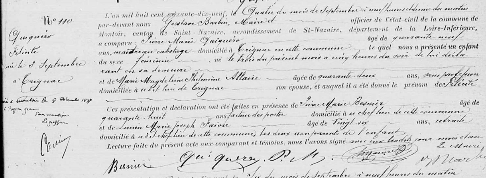 | Prénom | Félicie | | Nom de famille | Guiquéro | L'an mil huit cent soixante-dix neuf, le quatre du mois de Septembre à neuf heures et demie du matin par-devant nois Gustave Barbin, Maire et officier de l'état-civil de la Loire-Inférieure a comparu, Pierre Marie Guiquèro âgé de quarante neuf ans maître au cabotage domicilié à Trignac en cette commune lequel nous a présenté un enfant du sexe féminin, né le trois du présent mois à cinq heures du soir de lui déclarant en sa demeure et de Marie Magdeleine Philomène Allaire, âgée de quarante-deux ans, sans profession, domiciliée audit lieu de Trignac son épouse, et auquel il a été donné le prénom de Félicité. Ces présentations et déclaration ont été faites en présence de Pierre Marie Besnier, âgé de quarante-huit ans facteur des postes domicilié au chef lieu de cette commune, et de Lucien Marie Joseph Faivre, âgé de vingt-six ans, retraité domicilié audit chef lieu de cette commune, les deux non parents de l'enfant Lecture faite du présent acte aux comparant et témoins, nous l'avons signé avec eux, lesdits jour, mois, et an. En marge : Mariée à Montoir le 8 décembre 1897 ... Moyin Jean , Pour mention, le greffier | Naissance (plus...) | 7 mai 1879 | Montoir-de-Bretagne, Loire-Atlantique, FRANCE (Trignac, Montoir-de-Bretagne, 44103, Loire Atlantique, Pays de la Loire, France) | Témoins au Bapteme/Naissance | Père Pierre Marie Guiquéro (12 mai 1830 - 29 octobre 1892) Témoin Pierre Marie Besnier Témoin Lucien Marie Joseph Faivre (1853)