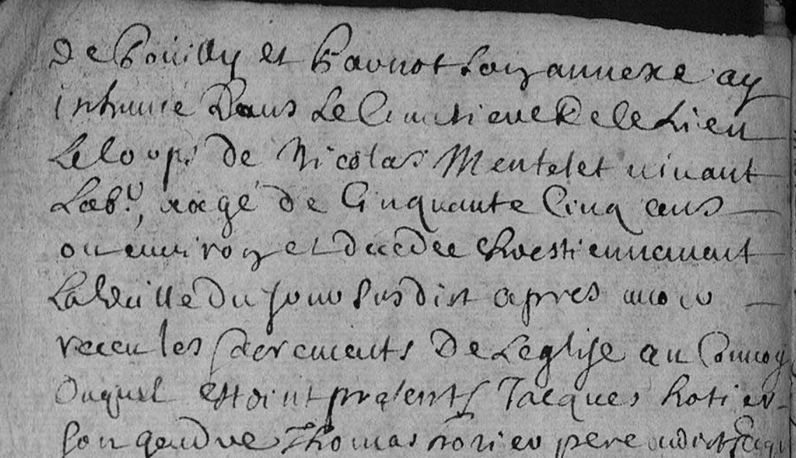 | Prénom | Nicolas | | Nom de famille | Meutelet | | Profession | Laboureur | l'an que dessus le vingt cinquieme mars je soussigné Nicola Brassinet ... curé de Pouilly es Parnot son annexe ay inhumé dans le cimetiere de ce lieu le corps de Nicolas Meutelet vivant laboureur, âgé de cinquante cinq ans ou environ et décédé chretiennement la veille du jour susdit après avoir reçu les sacrements de l'église au convoy auquel ... présents Jacques Rozier son gendre, Thomas Norieu pere .... qui ont tous déclaré ne savoir signer de ce interpellés | Décès (plus...) | 24 mars 1691 | Parnoy-en-Bassigny, Haute-Marne, FRANCE (, Parnot, 52377, Haute Marne, Grand-Est, France) | Témoins Décès | Témoin Jacques Rozier Témoin Thomas Norieu