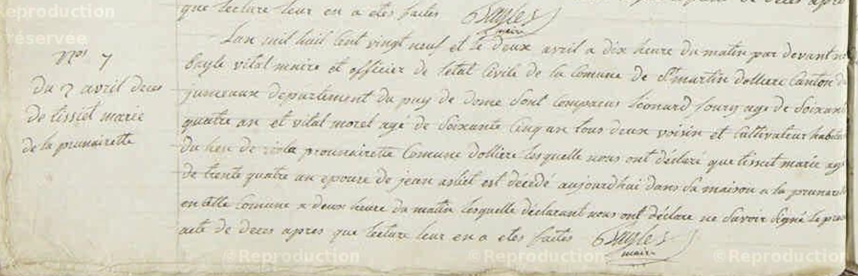 | Prénom | Marie | | Nom de famille | Tissert | L'an mil huit cent vingt neuf et le deux avril à dix heures du matin par devant nous Bayle Vital maire et officier de l'état civil de la commune de St Martin d'Ollières canton de Jumeaux, département du puy de dome sont comparus Léonard Foury âgé de soixante quatre ans et Vital Morel âgé de soixante cinq ans tous deux voisins et cultivateurs habitant du lieu de .. la prounairette commune d'Ollière lesquels nous ont déclaré que tissert Marie âgé de trente quatre ans epouse de Jean Astiet est décédée aujourd'hui dans sa maison à la prunairette en cette commune à deux heures du matin lesquels déclarants nous ont déclaré ne savoir signer le présent acte de décès après que lecture leur en a été faite (il est indiqué 'morte en couche' dans l'acte de naissance de sa fille Astier Marie) | Décès (plus...) | 2 avril 1829 | Saint-Martin-d'Ollières, Puy-de-dôme, FRANCE (, Saint-Martin-d'Ollières, 63376, Puy de Dôme, Auvergne-Rhône-Alpes, France) |