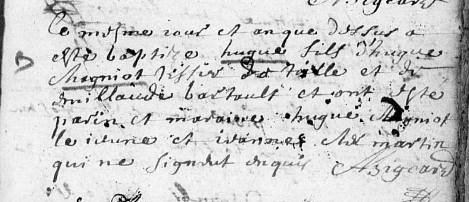 | Prénom | Hugues | | Nom de famille | Chagniot | | Profession | Laboureur aux Champ de Chose à Cussy | | Naissance | 17 novembre 1675 | Anost, Saône-et-Loire, FRANCE (, Anost, 71009, Saône et Loire, Bourgogne-Franche-Comté, France) | | Baptême | 17 novembre 1675 | Anost, Saône-et-Loire, FRANCE (, Anost, 71009, Saône et Loire, Bourgogne-Franche-Comté, France) |