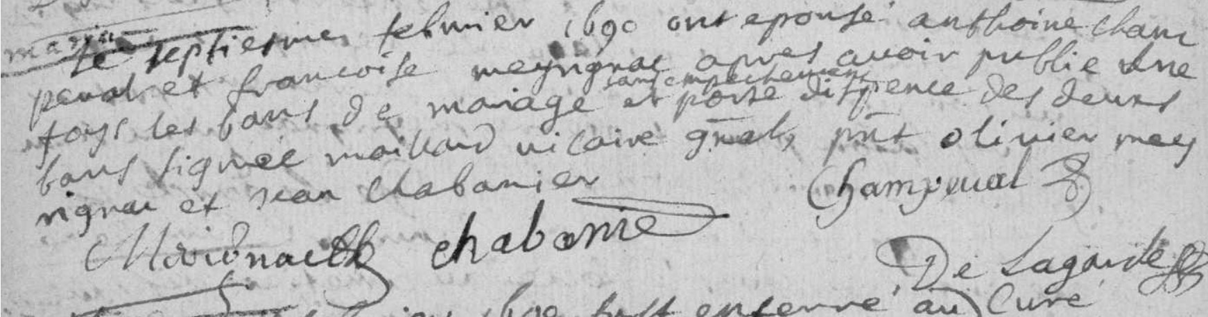 le septieme fevrier 1690 ont epousé Anthoine Champeval et Françoise Meyrignac après avoir publié ... tous les bans de mariage sans empechement et porte dispense des deux bans signé Maillard vicaire ... ... Olivier Meyrignac et Jean Chabanier