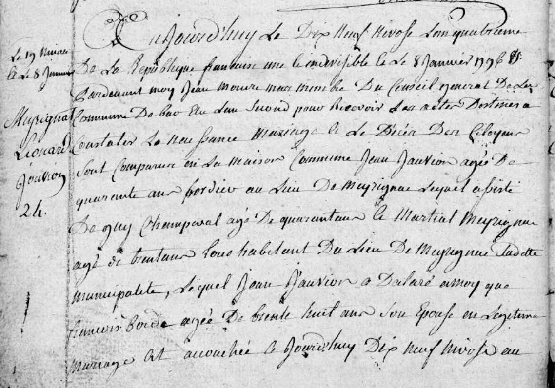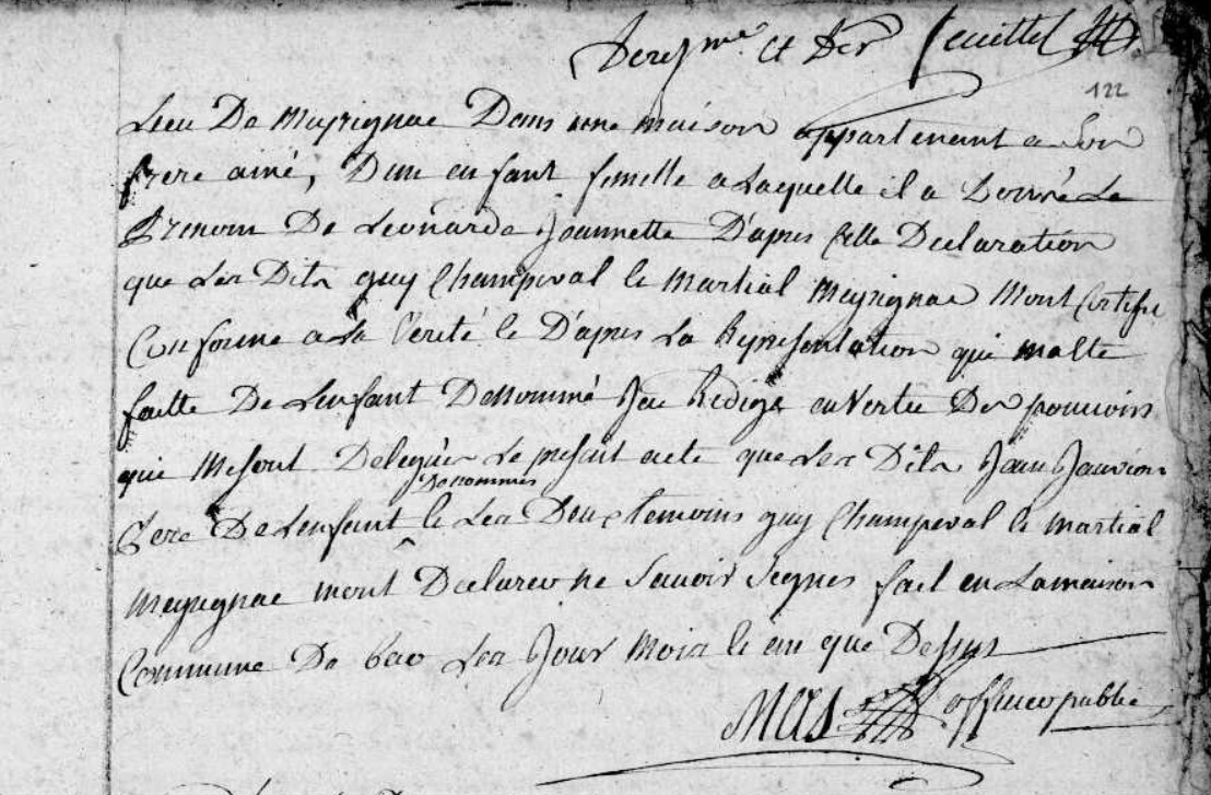 | Prénom | Léonarde | | Nom de famille | Jauvion | .... Lequel Jean Jauvion a déclaré à moy que Françoise Bordes âgée de trente huit ans son epouse en légitime mariage est accouchée ce jourd'huy dix neuf nivose au lieu de Meyrignac dans une maison appartenant à son frère ainé; d'un enfant femelle à laquelle il a donné le prénom de Léonarde Jannette. D'après cette déclaration que .. Dit... Guy Champeval le Martial Meyrignac m'ont certifié conforme à la vérité l.D'après la Représentation qui ma été faitte de l'enfant dess.... .... | Naissance (plus...) | 9 janvier 1796 | Bar, Corrèze, FRANCE (, Bar, 19016, Corrèze, Nouvelle-Aquitaine, France) |