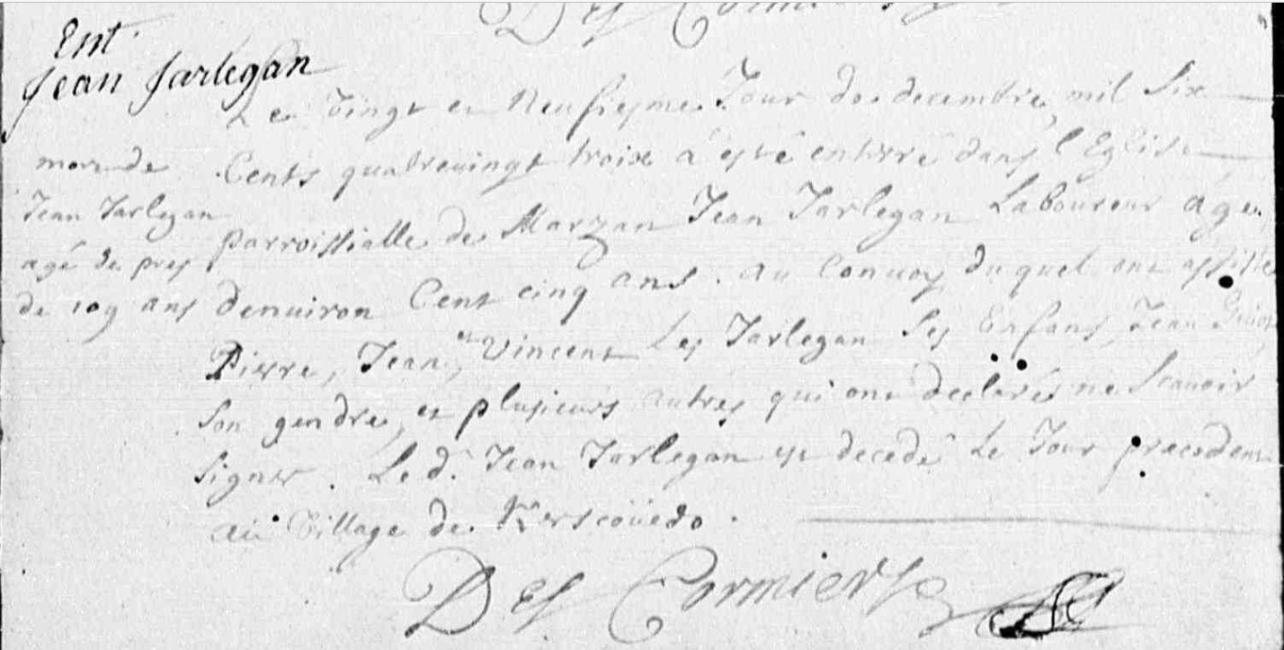 | Prénom | Jean | | Nom de famille | Jarlegan | | Naissance | 1 février 1607 | Marzan, Morbihan, FRANCE (, Marzan, 56126, Morbihan, Bretagne, France) | | Baptême | 1 février 1607 | Marzan, Morbihan, FRANCE (, Marzan, 56126, Morbihan, Bretagne, France) | le vingt et neufierme jour de décembre mil six cents quatre vingt treize a esté enterré dans l'église paroissialle de Marzan Jean Jarlegan laboureur âgé d'environ cent cinq ans au convoy duquel ont assisté Pierre, Jean, Vincent les Jarlegan ses enfants, Jean Guiot son gendre et plusieurs autres qui ont déclarés ne savoir signer. le d. Jean Jarlegan est decedé le jour précédent au village de Kerscoüedo | Décès (plus...) | 28 décembre 1693 à l'âge de 86 ans | Marzan, Morbihan, FRANCE (, Marzan, 56126, Morbihan, Bretagne, France) | Témoins Décès | Témoin Pierre Jarlegan Témoin Jean Jarlegan Témoin Vincent Jarlegan Témoin Jean Guiot