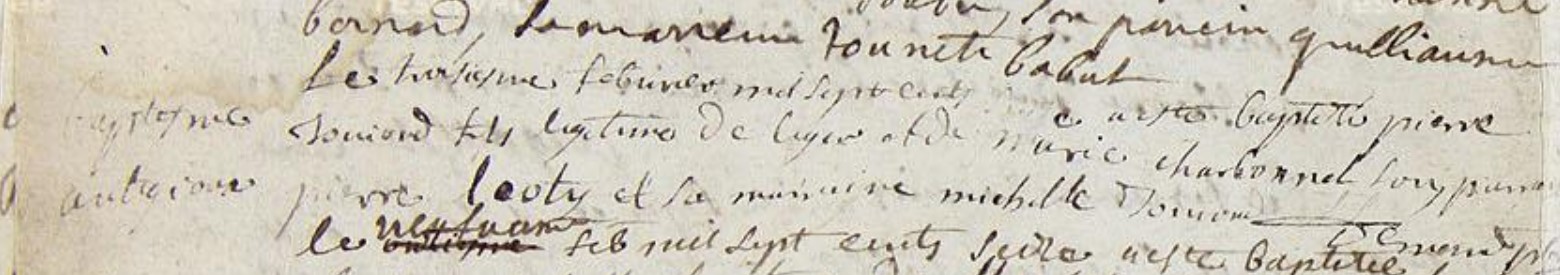| Prénom | Pierre | | Nom de famille | Jouvion | Le troisieme février mil sept cent seize a été baptisé Pierre Jouviond fils légitime de Liger et de Marie Charbonnel son parrain Pierre Leoty et sa marraine Michelle Jouvion | Naissance (plus...) | 3 février 1716 | Bagnols, Puy-de-dôme, FRANCE (Antijoux, Bagnols, 63028, Puy de Dôme, Auvergne-Rhône-Alpes, France) | | Baptême | 3 février 1716 | Bagnols, Puy-de-dôme, FRANCE (, Bagnols, 63028, Puy de Dôme, Auvergne-Rhône-Alpes, France) | Témoins au Bapteme/Naissance | Parrain Pierre Leoty Marraine Michelle Jouvion