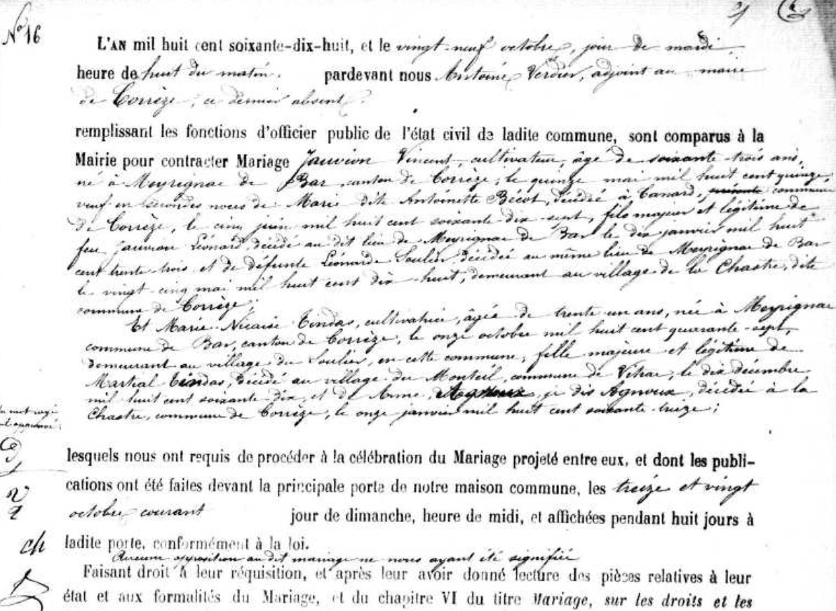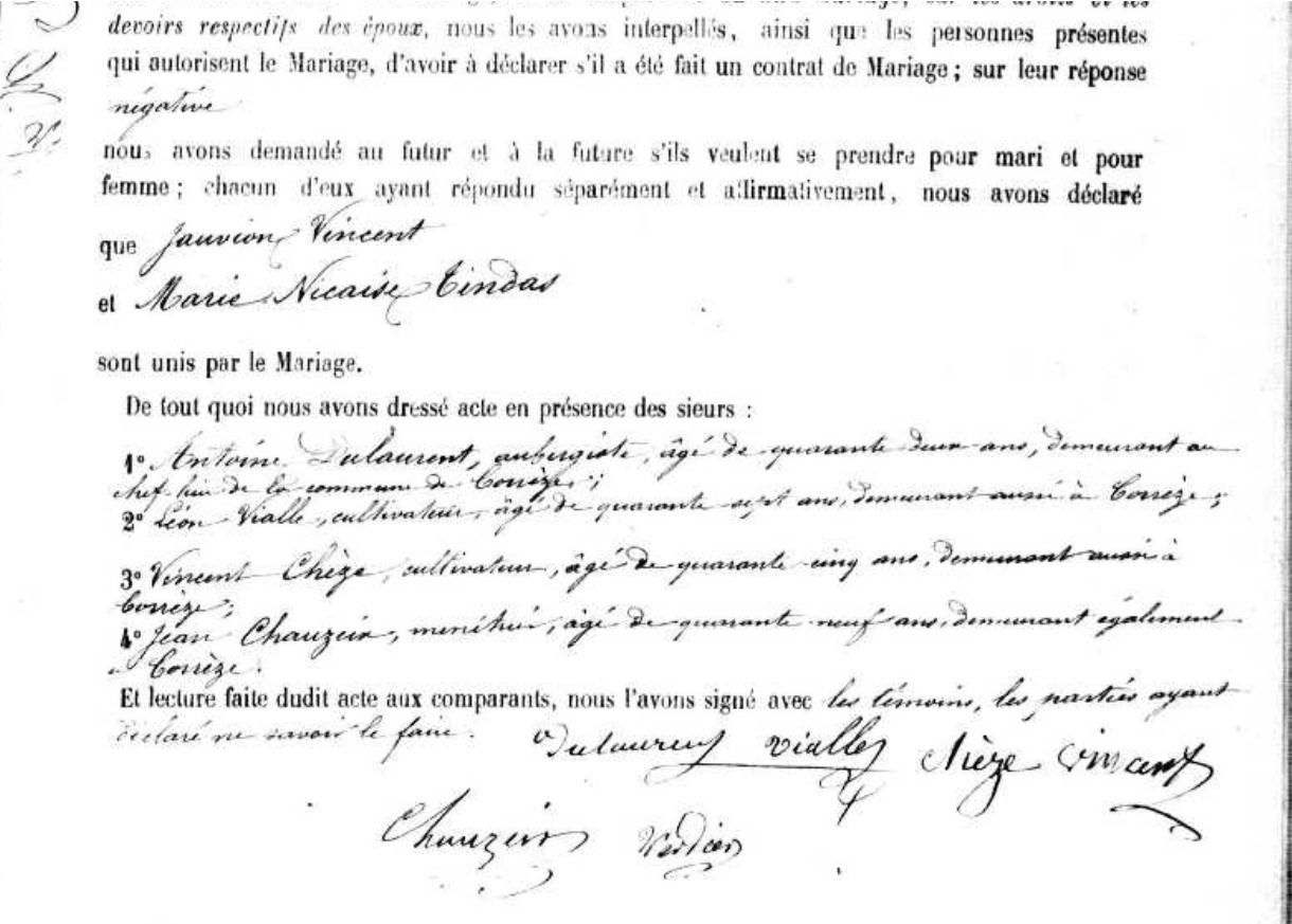 | Union | Vincent Jauvion (15 mai 1815 - 18 février 1897) | l'an mil huit cent soixante-dix-huit et le vingt-neuf octobre, jour de mardi, heure de huit du matin, pardevant nous Antoine Verdier, adjoint au maire de Corrèze, ce dernier absent, remplissant les fonctions d'officier public de l'état civil de ladite commune sont comparus à la mairie pour contracter Mariage Jauvion Vincent, cultivateur, âgé de soixante-trois ans né à Meyrignac de Bar, canton de Corrèze, le quinze mai mil huit cent quinze, veuf en secondes noces de Marie dite Antoinette Bécot, décédée à Canard, commune de Corrèze, le cinq juin mil huit cent soixante-dix-sept, fils majeur et légitime de feu Jauvion Léonard ,décédé audit lieu de Meyrignac de Bar le dix janvier mil huit cent trente-trois et de défunte Léonarde Soulier, décédée au même lieu de Meyrignac de Bar le vingt-cinq mai mil huit cent-dix-huit, demeurant au village de la Chastre, dite commune de Corrèze Et Marie-Nicaise Tendas, cultivatrice, âgée de trente-un ans, née à Meyrignac commune de Bar, Canton de Corrèze, le onze octobre mil huit cent-quarante-sept deleurant au village du Soulier, en cette commune, fille majeure et légitime de Martial Tindas, décédé au village du Monteil, commune de Vitrac, le dix décembre mil huit cent soixante-dix et de Anne Agn.... dis Agnoux, décédée à la Chastre, commune de Corrèze, le onze janvier mil huit cent soixante-treize | Mariage (plus...) | 29 octobre 1878 à l'âge de 31 ans | Corrèze, Corrèze, FRANCE (, Corrèze, 19062, Corrèze, Nouvelle-Aquitaine, France) | Enfant(s) | Jean Jauvion (28 août 1879)