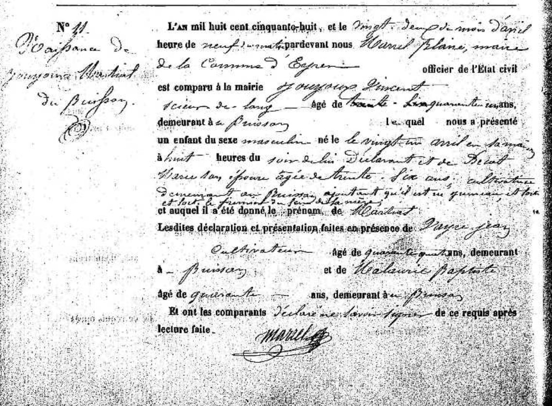 | Prénom | Martial | | Nom de famille | Jauvion | | Profession | Ouvrier mineur | L'an mil huit cent cinquante huit et le vingt deux du mois d'avril heure de neuf du matin, par devant nousMarrel Blaire Maire de la commune d'Eyrein officier de l'état civil est comparu à la Mairie JOUYOUX Vincent scieur de long âgé de quarante un an demeurant à Brisson lequel nous a présenté un enfant du sexe masculin né le vingt un avril en sa maison à huit heures du soir de lui déclarant et de BECOT Marie son épouse âgée de trente six ans cultivatrice demeurant au Brisson ajoutant qu'il est né un jumeau est sorti le premier du sein de sa mère et auquel il a été donné le prénom de Martial. Les dites déclaration et présentation faites en présence de VAYRE Jean cultivateur âgé de quarante quatre ans demeurant à Buisson et de MALAURIE Baptiste âgé de quarante ans demeurant à Buisson. Et ont les comparants déclaré ne savoir signer de ce requis aprés lecture faite. Signé Marrel | Naissance (plus...) | 21 avril 1858 | Eyrein, Corrèze, FRANCE (Eyrein, Eyrein, 19081, Corrèze, Nouvelle-Aquitaine, France) |