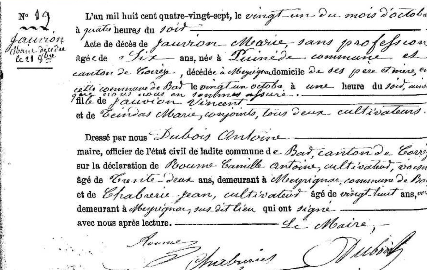 L'an mil huit cent quatre vingt sept, le vingt un du mois d'octobre à quatre heures du soir. Acte de décès de JAUVION Marie sans profession âgée de six ans, né à Perinede commune et canton de Corrèze, décédée à Meyrignac domicile de ses père et mère en cette commune de Bar le vingt un octobre à une heure du soir ainsi que nous nous en sommes assuré, fille de JAUVION Vincent et de TEINDAS Marie conjoints, tous deux cultivateurs. Dressé par nous Dubois Antoine Maire, officier de l'état civil de la dite commune de Bar, canton de Corrèze sur la déclaration de ROULME Camille Antoine cultivateur, voisin, âgé de trente deux ans, demeurant à Meyrignac commune de Bar et de CHABRERIE Jean cultivateur, âgé de vingt huit ans, voisin demeurant à Meyrignac sus dit lieu qui ont signé avec nous après lecture. Signé le Maire Dubois , Roume et Chabrerie
