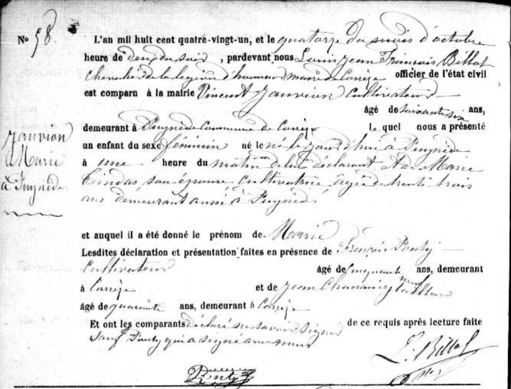 L'an mil huit cent quatre vingt un et le quatorze du mois d'octobre, heure de deux du soir, par devant nous Louis Jean François Billol Chevalier de la légion d'honneur Maire de Corrèze, officier de l'état civil est comparu à la Mairie Vincent JAUVION cultivateur âgé de soixante six ans demeurant à Perynède commune de Corrèze lequel nous a présenté un enfant du sexe féminin né le jour d'hui à Pirynède à une heur du matin de lui déclarant et de Marie TEINDAS son épouse cultivatrice âgée de trente trois ans demeurant aussi à Perynède et auquel il a été donné le prénom de Marie. Les dites déclaration et présentation faites en présence de François PONTY cultivateur âgé de cinquante ans demeurant à Corrèze et de Jean CHAMANY tailleur âgé de quarante ans demeurant à Corrèze. Et ont les comparants déclaré ne savoir signer de ce requis après lecture faite sauf Ponty qui a signé avec nous. Signé Ponty et Billol