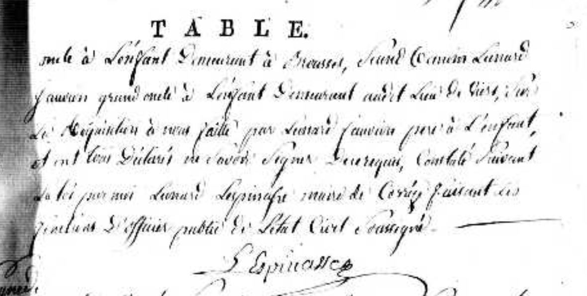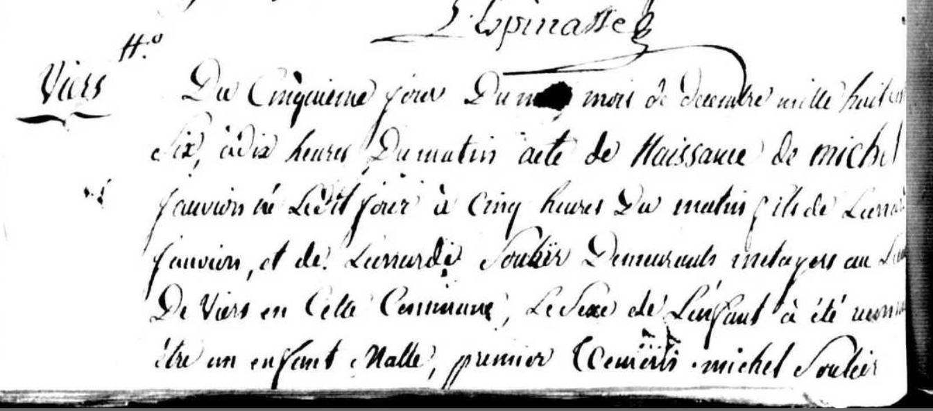du cinquieme jour de mois de décembre mille huit cent six à dix heures du matin acte de naissance de Michel Jauvion né ledit jour à cinq heures du matin, fil de Léonard Jauvion et de Léonarde Soulier demeurants métayers au lieu de Viers en cette commune, le sexe de l'enfant a été reconnu être un enfant male