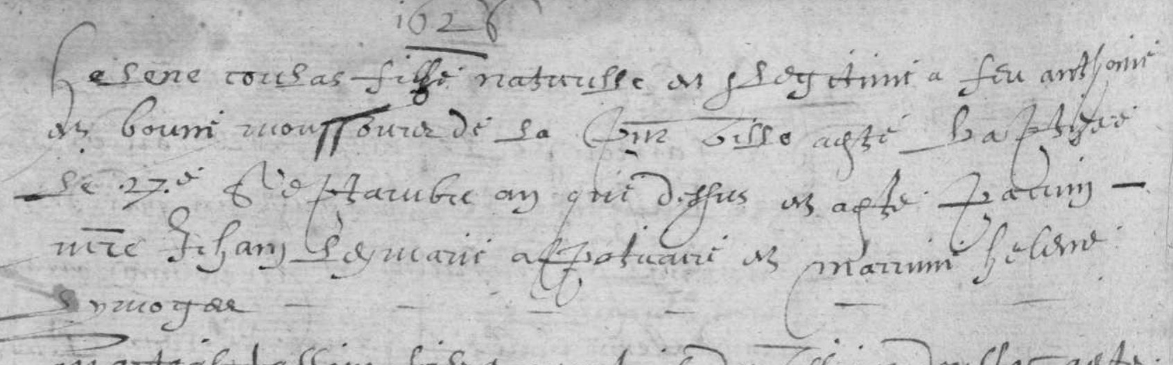 | Prénom | Hélène | | Nom de famille | Coulas | Helene Coulas fille naturelle et legitime à feu Anthoine et Boum Moussours de s .. ... esté baptisée le 27 Septembre .. .. .. .. .. parrain Mrt Jehan Leymarie appoticaire et marraine Helesne ..moyde | Naissance (plus...) | 27 septembre 1626 | Corrèze, Corrèze, FRANCE (Le Bourg, Corrèze, 19062, Corrèze, Nouvelle-Aquitaine, France) | | Baptême | 27 septembre 1626 | Corrèze, Corrèze, FRANCE (, Corrèze, 19062, Corrèze, Nouvelle-Aquitaine, France) | Helene Coulas fille à feu Anthoine et Bounot Moussoirs .. .. .. le premier novembre an qui dessus | Décès (plus...) | 1 novembre 1626 < 1 ans | Corrèze, Corrèze, FRANCE (Le Bourg, Corrèze, 19062, Corrèze, Nouvelle-Aquitaine, France) | | Sépulture | 1 novembre 1626 | Corrèze, Corrèze, FRANCE (, Corrèze, 19062, Corrèze, Nouvelle-Aquitaine, France) |