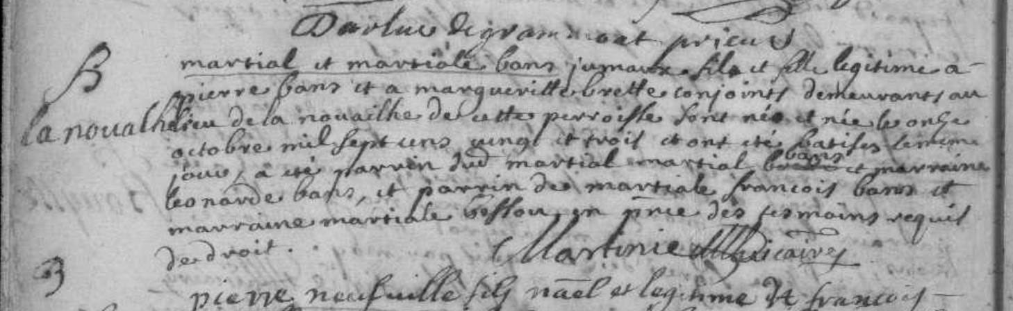 | Prénom | Martiale | | Nom de famille | Bans | | Naissance | 11 octobre 1723 | Corrèze, Corrèze, FRANCE (, Corrèze, 19062, Corrèze, Nouvelle-Aquitaine, France) | | Baptême | 11 octobre 1723 | Corrèze, Corrèze, FRANCE (, Corrèze, 19062, Corrèze, Nouvelle-Aquitaine, France) |