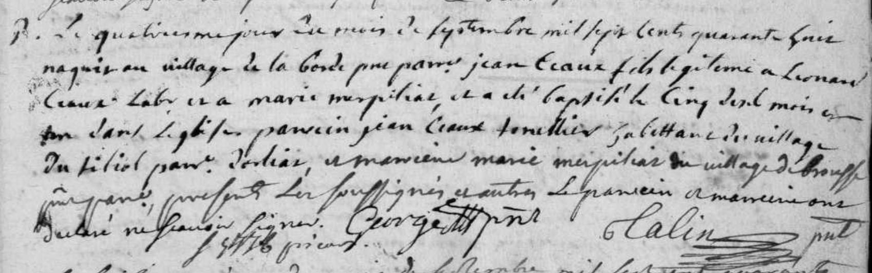 | Prénom | Jean | | Nom de famille | Ceaux | | Naissance | 4 septembre 1748 | Corrèze, Corrèze, FRANCE (La Borde, Corrèze, 19062, Corrèze, Nouvelle-Aquitaine, France) | | Baptême | 5 septembre 1748 | Corrèze, Corrèze, FRANCE (, Corrèze, 19062, Corrèze, Nouvelle-Aquitaine, France) |