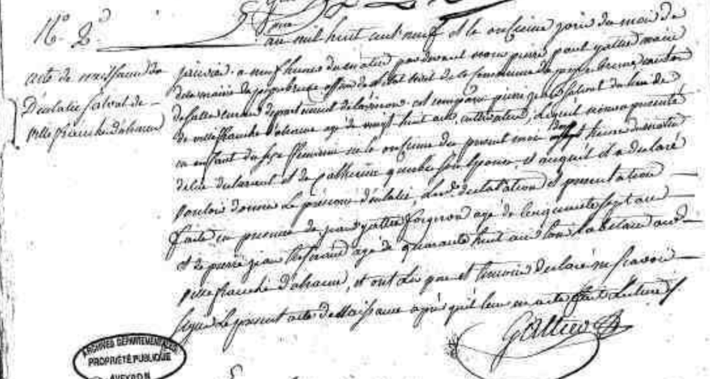 | Union | Jean 'Amans' Pradal 56 (26 août 1806) | L'an mil huit centre trente un et le deux juin a quatre heures du soir en notre maison commune à Ville franche d'Alrance par devant nous Gérard Antoine officier de l'état civil et maire dudit Villefranche canton de Salles Curan, arrondissement de Millau département de l'aveyron sont comparus Amans Pradal propriétaire du Malet né le vingt sept août mil huit cent six ainsi qu'il résulte du ... extrait de naissance délivré par le maire du Truel, fils légitime de Amans Pradal et de feue Jeanne Salvat propriétaires mariés dudit Malet commune d'Alrance d'une part de Saint Rome arrondissement de Saint Affrique d'une part, et Eulalie Salvat sans profession fille légitime de Pierre Jean Salvat et de feue Catherine Querbes mariés propriétaires du présent lieu ladite Querbes décédée quinze novembre mil huit cent dix d'après nos registres, lesquelles parties majeures et du consentement de leurs dits pères ici présents à cet effet nous ont requis de procéder à la célébration du mariage projeté entre elles et dont les publications ont eu lieu sur les principales portes des deux maisons communes Villefranche et Le Truel, savoir la première le vingt deux et la seconde le vingt neuf journ de dimanche du mois de may dernier ainsi qu'il ... de nos registres et du certificat délivré par le maire du Truel le trois juin coiurant aucune opposiiton audit mariage ne nous ayant été signifiée non plus que le maire du Truel ... de son certificat faisant droit à leur réquisition après leur avoir donné lecture de toutes les pièces [...] au nom de la loi que Pradal Amans et Salvat Eulalie sont unis par le mariage de tout quoi avons dressé acte en présence de Calvet Antoine agé de cinquante deux ans, de Galtier Joseph agé de quarante sept ans, de Sermet Joseph Pierre agé de trente quatre ans propriétaire de la Cagerie (?) de ? Solier agé de vingt sept ans propriétaire de Lagarcie les dits Calvet et Galtier propriétaires du présent lieu signés avec ledit Pradal futur époux et Salvat père de ladite salvat future épouse a dit ne savoir et ledit Pradal père a dit ne pouvoir à cause de son infirmité | Mariage (plus...) | 2 juin 1831 à l'âge de 22 ans | Alrance, Aveyron, FRANCE (La Capelle-Farcel, Alrance, 12008, Aveyron, Occitanie, France) | Témoins au Mariage | Epouse Eulalie Salvat 57 (11 janvier 1809) Témoin Antoine Calvet (1777) Témoin Joseph Galtier (1784) Témoin Joseph Pierre Sermet (1797) Témoin ? Solier (1804)