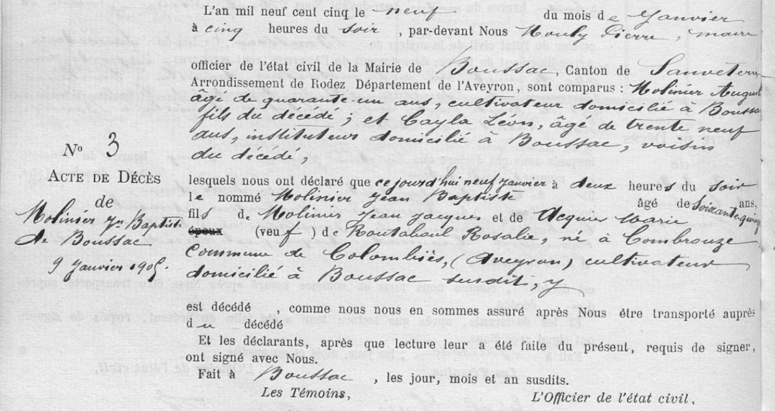 | Prénom | Jean Baptiste 'Baptiste' | | Nom de famille | Molinier | | Profession | Cultivateur | | Naissance | 8 mars 1831 | Colombiès, Aveyron, FRANCE (, Colombiès, 12068, Aveyron, Occitanie, France) | l'an mil neuf cent cinq le neuf du mois de janvier à cinq heures du soir, par-devant nous Mouly Pierre, maire officier de l'état civil de la mairie de Boussac, Canton de Sauveterre Arrondissement de Rodez Département de l'Aveyron, sont comparus Molinier Auguste âgé de quarante un ans, cultivateur domicilié à Boussac fils du décédé et Cayla Léon, âgé de trente neuf ans, instituteur domicilié à Boussac, voisin du décédé Lesquels nous ont déclaré que ce jourd'hui neuf janvier à deux heures du soir le nommé Molinier Jean Baptiste âgé de soixante quinze ans fils de Molinier Jean Jacques et de Acquier Marie (veuf) de Routaboul Rosalie, né à Combrouze Commune de Colombiés (Aveyron) cultivateur domicilié à Boussac susdit, y est décédé, comme nous nous en sommes assuré après Nous être transporté auprès du décédé Et les déclarants, après que lecture leur a été faite du présent, requis de signer ont signé avec Nous | Décès (plus...) | 9 janvier 1905 à l'âge de 74 ans | Boussac, Aveyron, FRANCE (, Boussac, 12032, Aveyron, Occitanie, France) | Témoins Décès | Témoin Antoine Auguste Molinier (30 décembre 1863)