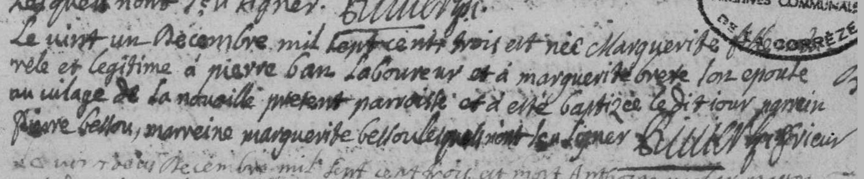 | Prénom | Marguerite | | Nom de famille | Bans | | Naissance | 21 décembre 1703 | Corrèze, Corrèze, FRANCE (, Corrèze, 19062, Corrèze, Nouvelle-Aquitaine, France) | | Baptême | 21 décembre 1703 | Corrèze, Corrèze, FRANCE (, Corrèze, 19062, Corrèze, Nouvelle-Aquitaine, France) | | Décès | 6 mars 1768 à l'âge de 65 ans | Meyrignac-l'Église, Corrèze, FRANCE (, Meyrignac-l'Église, 19137, Corrèze, Nouvelle-Aquitaine, France) |