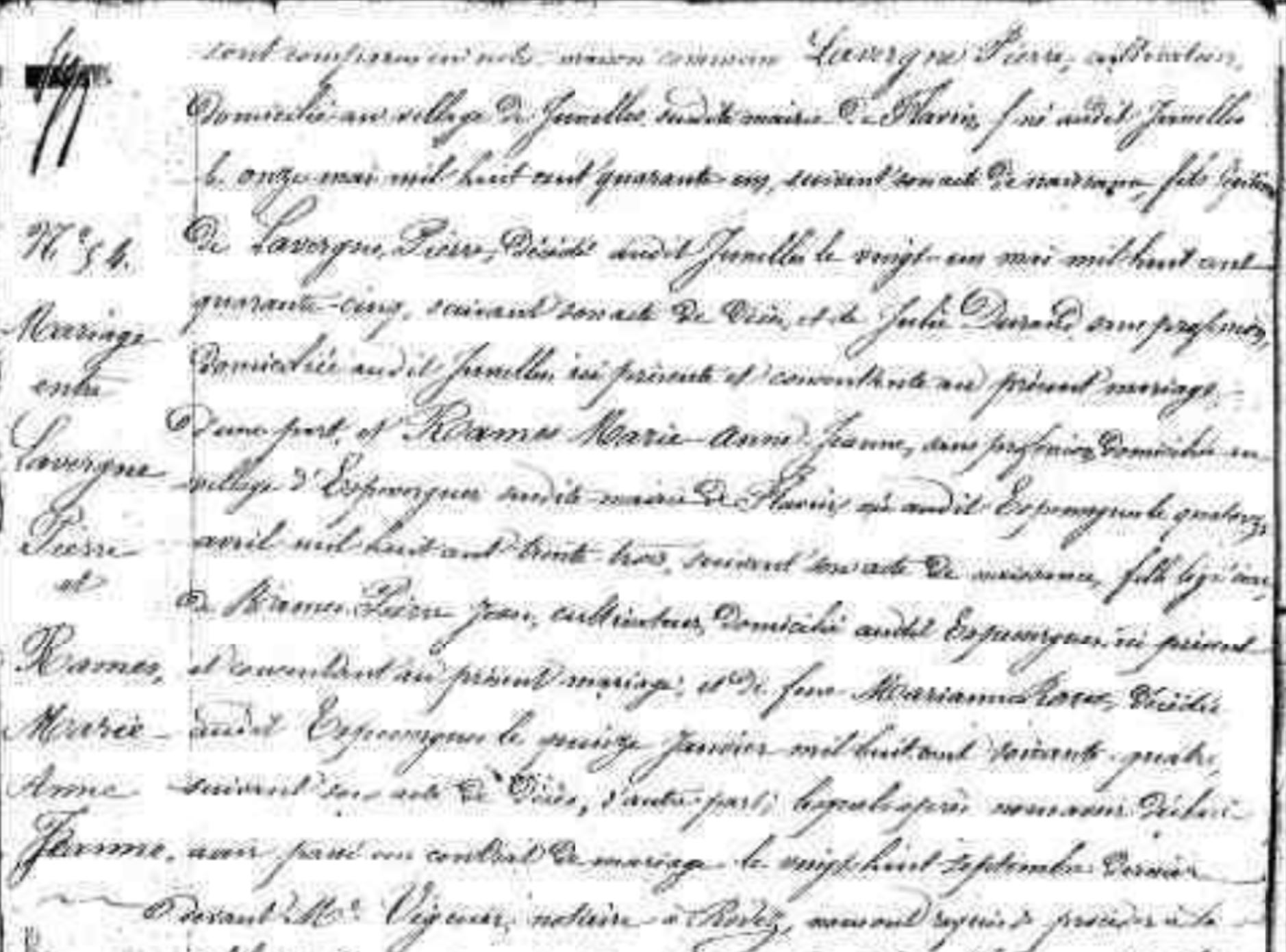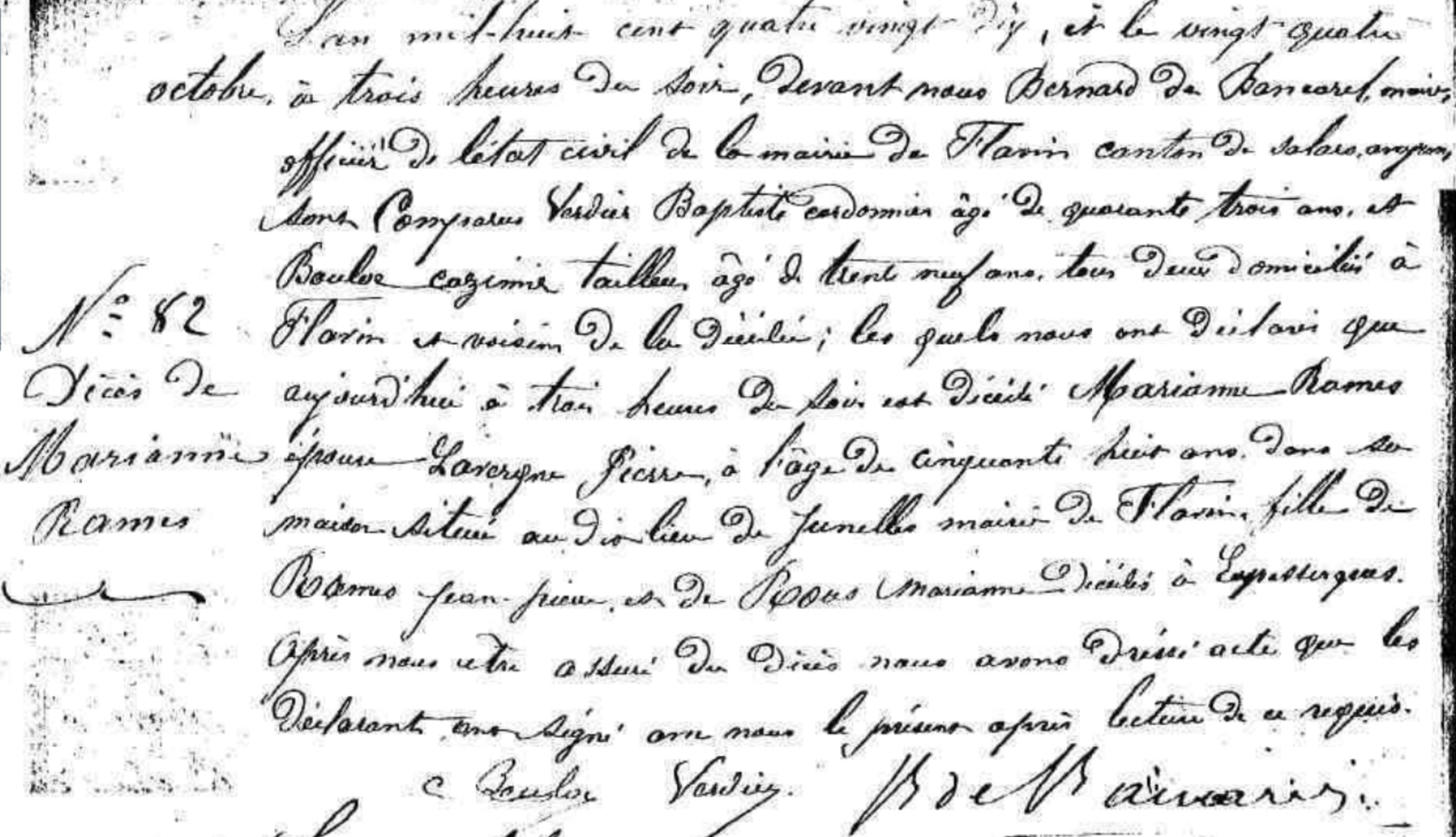 | Décès RAMES Marianne 53 Le 24/10/1890 à Flavin L'an mil huit cent quatre vingt dix et le vingt quatre octobre à trois heures du soir devant nous Bernard De Bancarel maire officier de l'état civil de la mairie de Flavin canton de Salars aveyron sont comparus Verdies Baptiste … âgé de quarante trois ans et Bouloc Cazimir tailleur âgé de trente neuf ans tous deux domiciliés à Flavin et voisin de la décédée ; lesquels nous ont déclaré que aujourd'hui à trois heures du soir est décédé Marianne Rames épouse Lavergne Pierre à l'âge de cinquante huit ans dans la maison située au dit lieu de Junelles mairie de Flavin fille de Rames Jean Pierre et de Rous Marianne décédé à Espessergues. Après nous être assuré du décès, nous avons dressé acte que les déclarants ont signé avec nous le présent après lecture de ce requis. | Décès (plus...) | 24 octobre 1890 à l'âge de 57 ans | Flavin, Aveyron, FRANCE (, Flavin, 12102, Aveyron, Occitanie, France) | Témoins Décès | Témoin Baptiste Verdies (1847) Témoin Cazimir Bouloc (1851) Epoux Joseph Pierre Lavergne 52 (11 mai 1841)