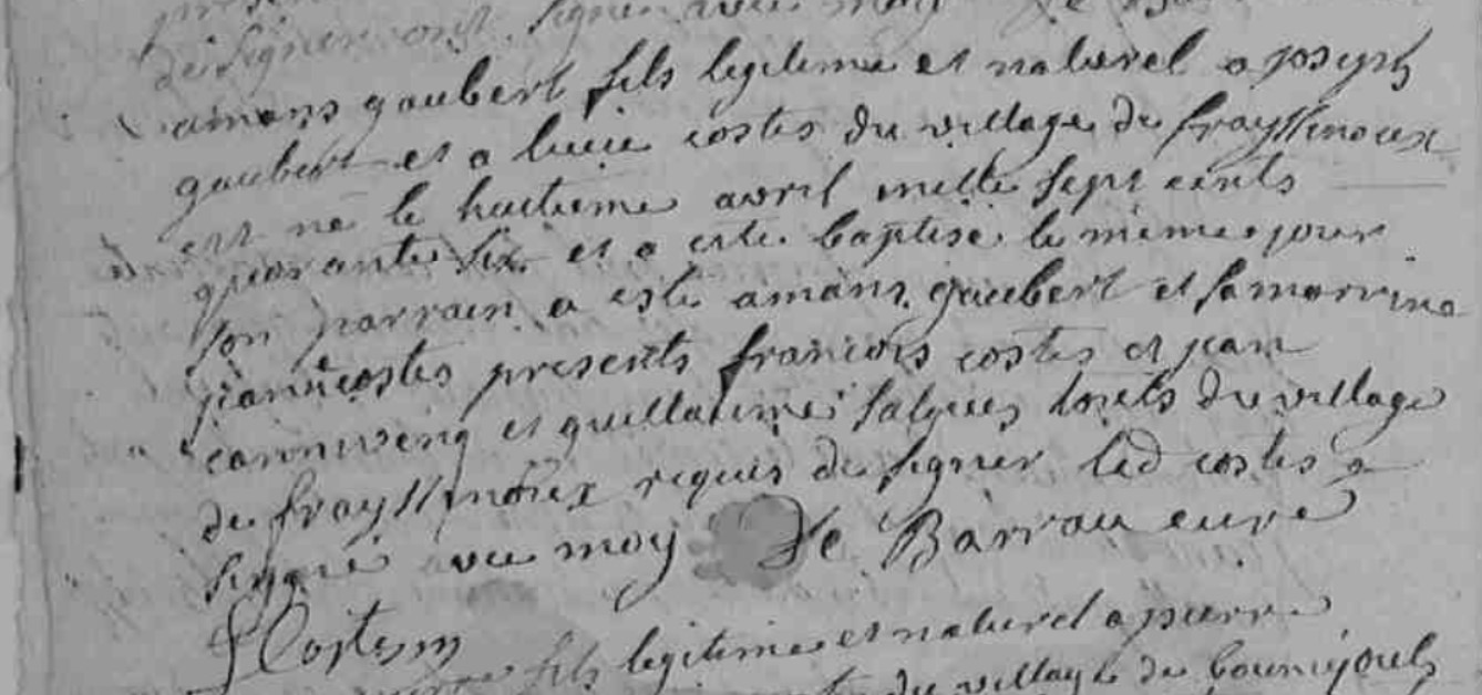 | Prénom | Amans | | Nom de famille | Gaubert | | Profession | Cultivateur | Amans Gaubert fils naturel et légitime à Joseph Gaubert et à Lucie Costes du village de Frayssinoux est né le huitième avril mille sept cent quarante six et a été baptisé le même jour. Son parrain a été Amans Gaubert et sa marraine Jeanne Costes présents François Costes et Jean Cannivenq et Cuillaume Salgues tous du village du frayssinoux requis de signer ledit costes a signé avec moi. | Naissance (plus...) | 8 avril 1746 | Trémouilles, Aveyron, FRANCE (Frayssinous, Trémouilles, 12283, Aveyron, Occitanie, France) | | Baptême | 8 avril 1746 | Trémouilles, Aveyron, FRANCE (, Trémouilles, 12283, Aveyron, Occitanie, France) | Témoins au Bapteme/Naissance | Parrain Amans Gaubert Marraine Jeanne Costes Témoin François Costes Témoin Jean Cannivenq Témoin Guillaume Salgues