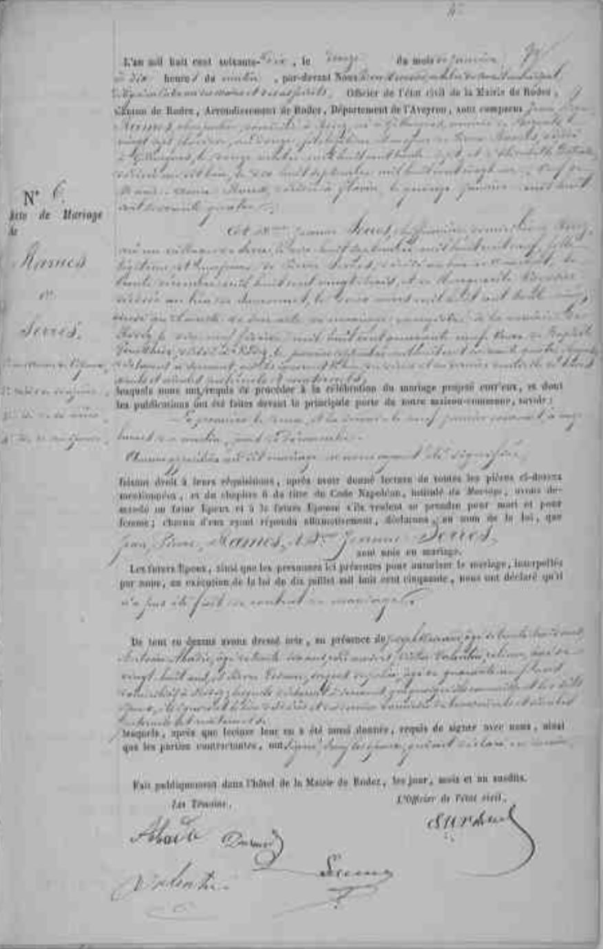 | Union | Marie-Anne 'Marianne' Rous 107 (6 juillet 1809 - 15 janvier 1864) | Mariage Jean-Pierre Rames Marianne Rous 106-107 Le 17/11/1830 à Flavin L'an mil huit cent trente et le dix-sept novembre à … heures du matin par devant nous Camille Colomb maire officier de l'état civil de la commune de Flavin, canton de Salars département de l'Aveyron ont comparu en notre maison commune Jean-Pierre Rames né le vingt-sept pluviose an douze à deux heures du matin au village de Gillorgues mairie de Bozouls domicilié depuis environ seize mois au lieu et mairie de Flavin majeur et fils de Pierre Rames tisserand domicilié au dit village de Gillorgues consentant ainsi qu'il en résulte de la procuration passée à Bozouls le quatre novembre mil huit cent trente devant Bonefou (?) notaire laquelle sera annexée au présent acte et de feu Elisabeth Lestrade mariés ; et Marianne Rous sans profession née au village d'Espessergues mairie de Flavin le six juillet mil huit cent neuf à sept heures du matin domiciliée actuellement au village du Puech-Flettes sus dites mairie de Flavin fille majeure de Jean Rous décédé au dit village d'Espessergues le cinq avril mil huit cent vingt sept comme il est existant par l'acte de décès contenu dans le registre de la mairie de Flavin et de Jeanne Cautet (Caulet ?) son épouse ici présente et consentante au présent mariage lesquels nous ont requis de procéder à la célébration du mariage projeté entre eux et dont les publications ont été faites devant la principale porte de notre maison commune ; savoir la première le sept et la seconde le quatorze novembre courant jours du dimanche à dix heures du matin et à la mairie de Bozouls la première le troisième et la seconde le quatrième dimanche du mois d'octobre mil huit cent trente à dix heures du matin. Aucune opposition audit mariage ne nous ayant été signifiée ni à la mairie de Bozouls comme il résulte du certificat de publication délivré le quatre novembre mil huit cent trente, faisant droit à leur réquisition, après avoir donné lecture de toutes les pièces cy-dessus mentionnées et du chapitre six du titre du titre code civil intitulé du mariage avons demandé au futur époux et à la future épouse s'ils veulent se prendre pour mari et pour femme, chacun d'eux ayant répondu séparément et affirmativement déclarons au nom de la loi que Jaen-Pierre Rames et Marianne Rous sont unis par le mariage ; de quoi nous avons donné acte en présence de Alexandre Privat âgé de trente-trois ans, François Daures âgé de trente ans, de Jean Bousquet âgé de vingt-trois ans tous trois scieurs de long domiciliés au village d'Inières mairie de Ste Radegonde et de françois Vayssettes âgé de cinquante-huit ans cultivateur domicilié au village du Terrail mairie de Flavin lesquels après que lecture du présent leur a été faite requis de signer ainsi que les parties contractantes, le dit Privat a signé avec nous seulement, les autres ayant déclaré ne savoir le faire | Mariage (plus...) | 17 novembre 1830 à l'âge de 26 ans | Flavin, Aveyron, FRANCE (, Flavin, 12102, Aveyron, Occitanie, France) | Enfant(s) | Marie 'Rose' Rames (3 septembre 1831 - 8 novembre 1876)