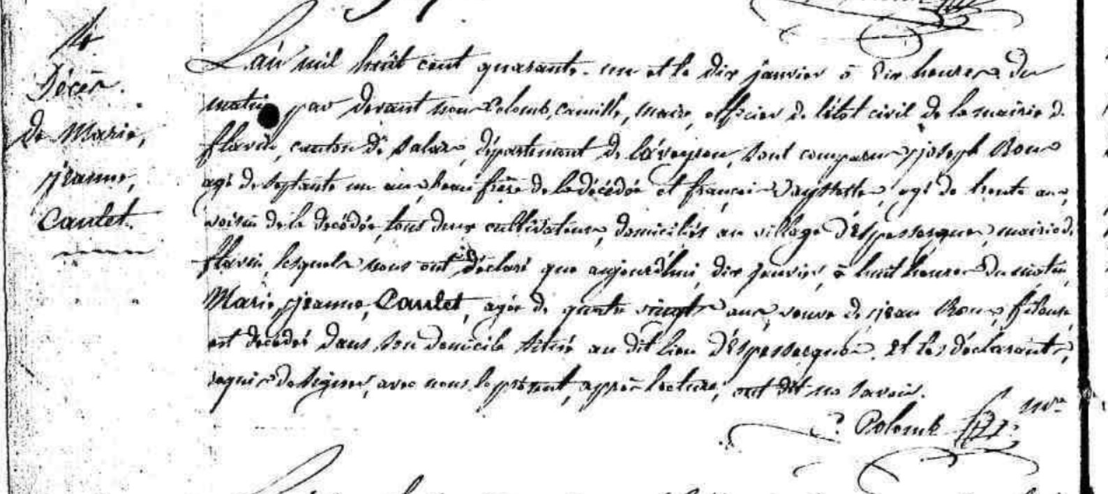 | Prénom | Jeanne | | Nom de famille | Caulet | Jeanne Caulet fille légitime à Jean Caulet et à Marie Anne Boyer mariés du village de la Cassagnhe paroisse de Ceignac est née et a été baptisée le vingt quatre janvier mil sept cens soixante huit son parrain a été François Delmas et sa marraine Jeanne Boyer qui requis de signer ont dit ne savoir | Naissance (plus...) | 24 janvier 1768 | Calmont, Aveyron, FRANCE (Cassagne, Calmont, 12043, Aveyron, Occitanie, France) | | Baptême | 24 janvier 1768 | Calmont, Aveyron, FRANCE (, Calmont, 12043, Aveyron, Occitanie, France) | l'an mil huit cent quarante-un et le dix janvier à dix heures du matin par devant nous Colomb Camille, Maire officier de l'état civil de la mairie de Flavin, canton de Salars, département de l'Aveyron, sont comparu Joseph Rous agé de septante un ans beau frère de la décédée et François Vayssette âgé de trente ans voisin de la décédée tous deux cultivateurs, domiciliés au village d'espessergues mairie de Flovin lesquels nous ont déclaré que aujourd'hui dix janvier à huit heures du matin Marie Jeanne Caulet, âgée de quatre vingt ans veuve de Jean Roux ... est décédée dans son domicile situé au dit liey d'esperssergues et les déclarants requis de signer avec nous le présent, après lecture, ont dit ne savoir | Décès (plus...) | 30 janvier 1841 à l'âge de 73 ans | Calmont, Aveyron, FRANCE (Ceignac, Calmont, 12043, Aveyron, Occitanie, France) | | Sépulture | 30 janvier 1841 | Calmont, Aveyron, FRANCE (, Calmont, 12043, Aveyron, Occitanie, France) |