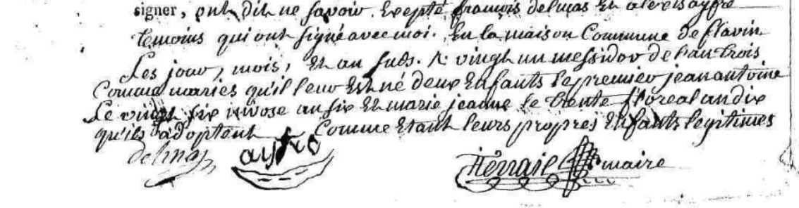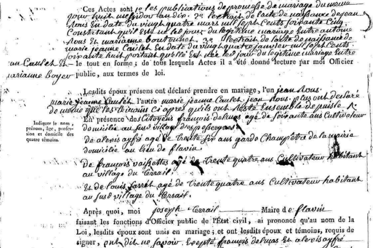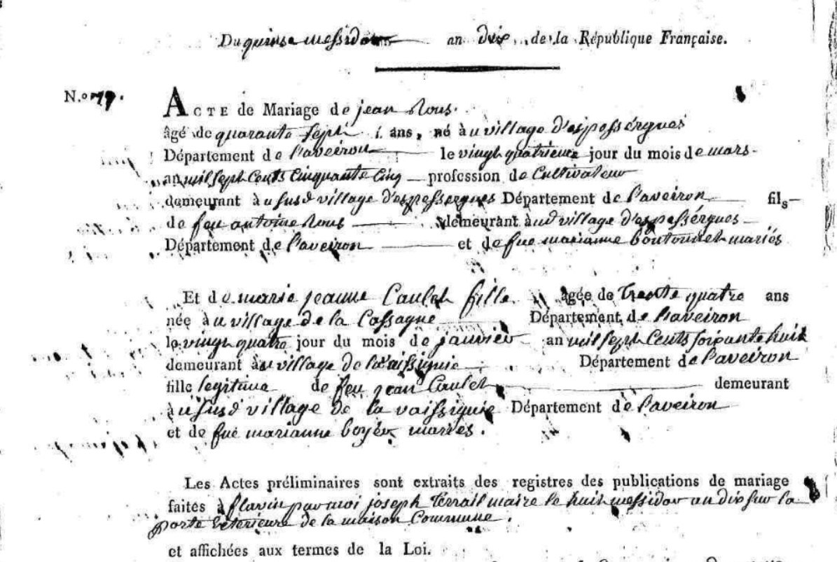 | Union | Jean Roux 214 (25 mars 1755 - 5 avril 1827) | Acte de Mariage de Jean Rous âgé de quarante sept ans, né au village d'Espersergues Département de l'Aveiron, le vingt quatrième jour du mois de mars mil sept cents cinquante cinq profession de cultivateur demeurant au susdit village d'Espersergues Département de l'Aveiron fils de feu Antoine Rous demeurant audit village d'Espersergues Département de l'aveiron, et de feue Marianne Boutounet mariés Et de Marie Jeanne Cautet fille âgée de trente quatre ans née au village de la Cassagne, Département de l'aveiron le vingt quatre jour du mois de janvier an mil sept cents soixante huit demeurant au village de l'Espersergues, Département de l'aveiron fille légitime de feu Jean Cautet demeurant a ... village de la Vaissiquie Département de l'aveiron et de feue Marianne Boyer mariés Les Actes préliminaires sont extraits des registres des publication de mariage faites à Flavin par moi Joseph Terrail marie le huit messidor an dix sur la porte extérieure de la maison commune et affichées aux termes de la Loi. Ces actes sont 1) les publications de mariage du même jour huit messidor an dix 2) l'extrait de l'acte de naissance de Jean Rous en date du vingt quatre mars mil sept cents soixante cinq constituant qu'il est né led jour du légitime mariage entre Antoine Rous et Marianne Boutounet 3) l'extrait de l'acte de naissace de Marie Jeanne Cautet en date du vingt quatre janvier mil sept cents soixante huit portant qu'elle est née led jour du légitime mariage entre ..an Cautet et Marianne Boyer - Le tout en forme; de tous lesquels Actes il a été donné lecture par moi Officier public, aux termes de loi Lesdits époux présens ont déclaré prendre en mariage, l'un Jean Rous Marie Jeanne Cauter l'autre Marie Jeanne Cauter Jean Rous plus ont déclaré de même que les témoins ci-après qu'ils ontresté ensemle depuis le ... En présence des citoyens François Delmas âgé de soixante ans cultivateur domicilié au lieu de Flavin De François Vaissettes âgé de trente quatre ans cultivateur habitant au village du Terrail Et de Louis Sarrét âgé de trente quatre ans cultivateur habitant au susdit village du Terrail Après quoi, moi Joseph Terrail Maire de Flavin faisant les fonctions d'Officier public de l'état civil, ai prononcé qu'au nom de la Loi, lesdits époux sont unis en mariage; et ont lesdits époux et témoins, requis de signer, ont dit ne savoir exepté François Delmas et ... témoins qui ont signé avec moi, En la maison Commune de Flavin Les jours, mois et An suds ... vingt messidor de l'an trois ... mariés leur est né deux enfant le premier Jean Antoine le vingt six nivose an six et Marie Jeanne le trente floreal an dix qu'ils adoptent comme étant leurs propres enfants légitimes | Mariage (plus...) | 4 juillet 1802 à l'âge de 34 ans | Flavin, Aveyron, FRANCE (, Flavin, 12102, Aveyron, Occitanie, France) | Enfant(s) | Jean Antoine Roux (15 janvier 1798)