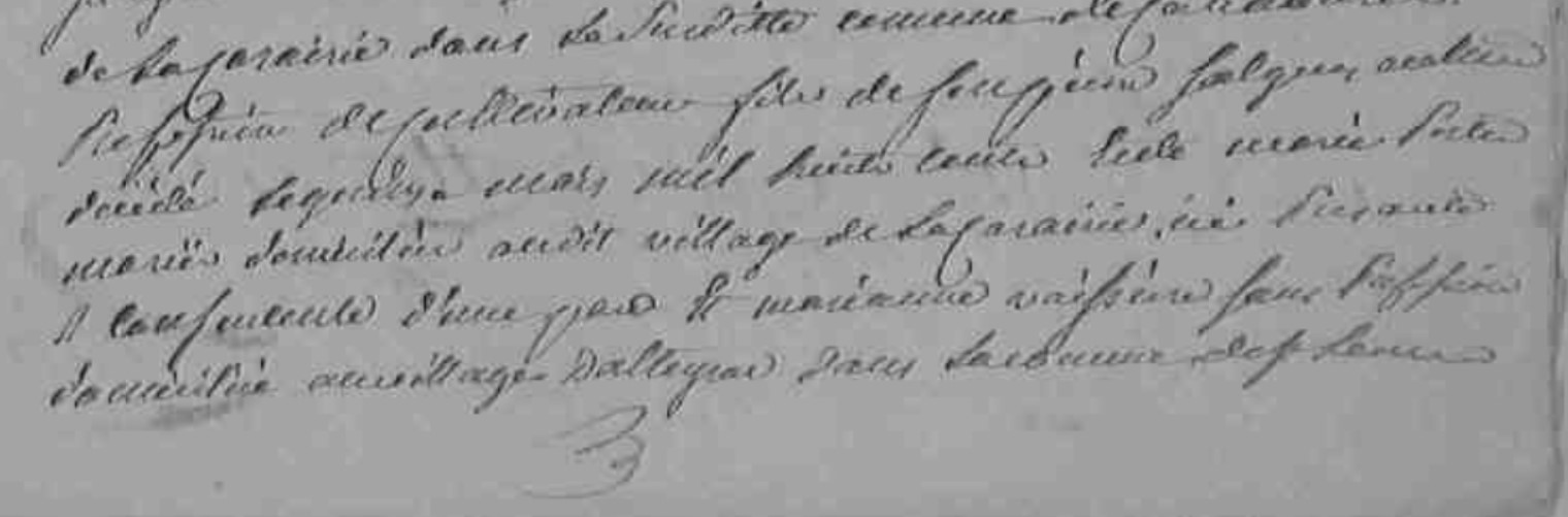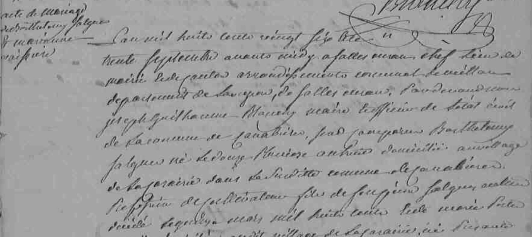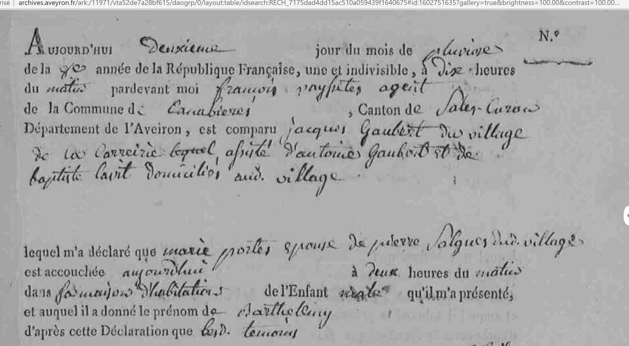 | Union | Marianne Vayssiere 109 (15 août 1795 - 13 mai 1841) | Mariage SALGUES Barthélémy VAISSIERE Marianne 108 - 109 Le 30/09/1826 à Salles Curan (Canabières) L'an mil huit cent vingt six et le trente septembre avant midi à Salles Curan chef lieu de mairie et de canton arrondissement communal de Millau département de l'aveyron, de Salles Curan par devant nous joseph guilhaume Blanchy maire et officier de l'état civil de la commune de Canabières sont comparus Barthélémy Salgues né le douze pluviose an huit domicilié au village de la Carrairie dans la sus dite commune de Canabières profession de cultivateur fils de feu jean Salgues … décédé le quinze (?) mars mil huit cent et de marie Portes mariés domiciliés au dit village de la Carrairie ici présent et consentant d'une part et Marianne vaissière sans profession domiciliée au village d'Alteyrac dans la … née le vingt huit thermidor an trois fille légitime à feu jean vaissière et de rose vaissière mariés domiciliés vivait au dit village d'Alteyrac décédés le dit vaissière le dix sept may dix huit cent dix huit et la dite rose vaissière … le trente mars mil huit cent vingt d'autre part Lesquels nous ont requis de procéder à la célébration du mariage projeté entre eux … les sollicitations ont été faites devant la principale porte de notre mairie … et sans aucune opposition audit mariage nous ait été signalées ni aux dites portes mairie de Saint Léons … avons demandé au futur époux et à la future épouse s'ils veulent se prendre pour mari et pour femme chacun d'eux nous ayant répondu séparément et affirmativement déclarons au nom de la loy que Barthélémy Salgues et Marianne Vaissière sont unis par le mariage de … quoy avons dressé acte la présence de jean portes restant pour fermier au domaine de Larguier dans présente commune de Salles Curan … âgé de cinquante sept ans, de pierre guy cultivateur âgé soixante ans domiciliés du dit village de La Carrairie dans la commune de Canabières ,de Charles Rudelle … âgé de soixante neuf ans, de bernard barttie cordonnier âgé soixante ans domicilié au dit Salles Curan lesquels après que lecture du présent acte leur ait été faite | Mariage (plus...) | 30 septembre 1826 à l'âge de 26 ans | Salles-Curan, Aveyron, FRANCE (, Salles-Curan, 12253, Aveyron, Occitanie, France) | Témoins au Mariage | Mère Marie Portes 217 (31 août 1773) Témoin Jean Portes (1769) Témoin Pierre Guy (1766) Témoin Charles Rudelle (1756) Témoin Bernard Barttie (1766)