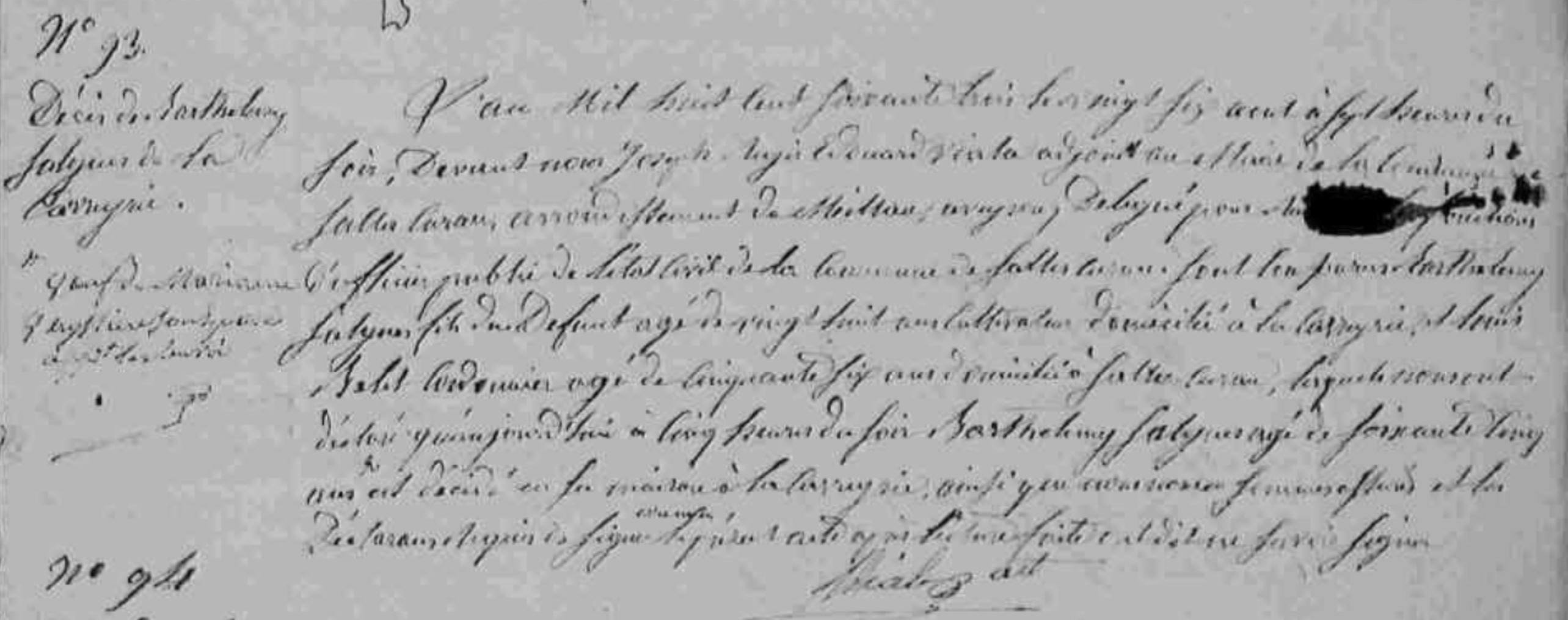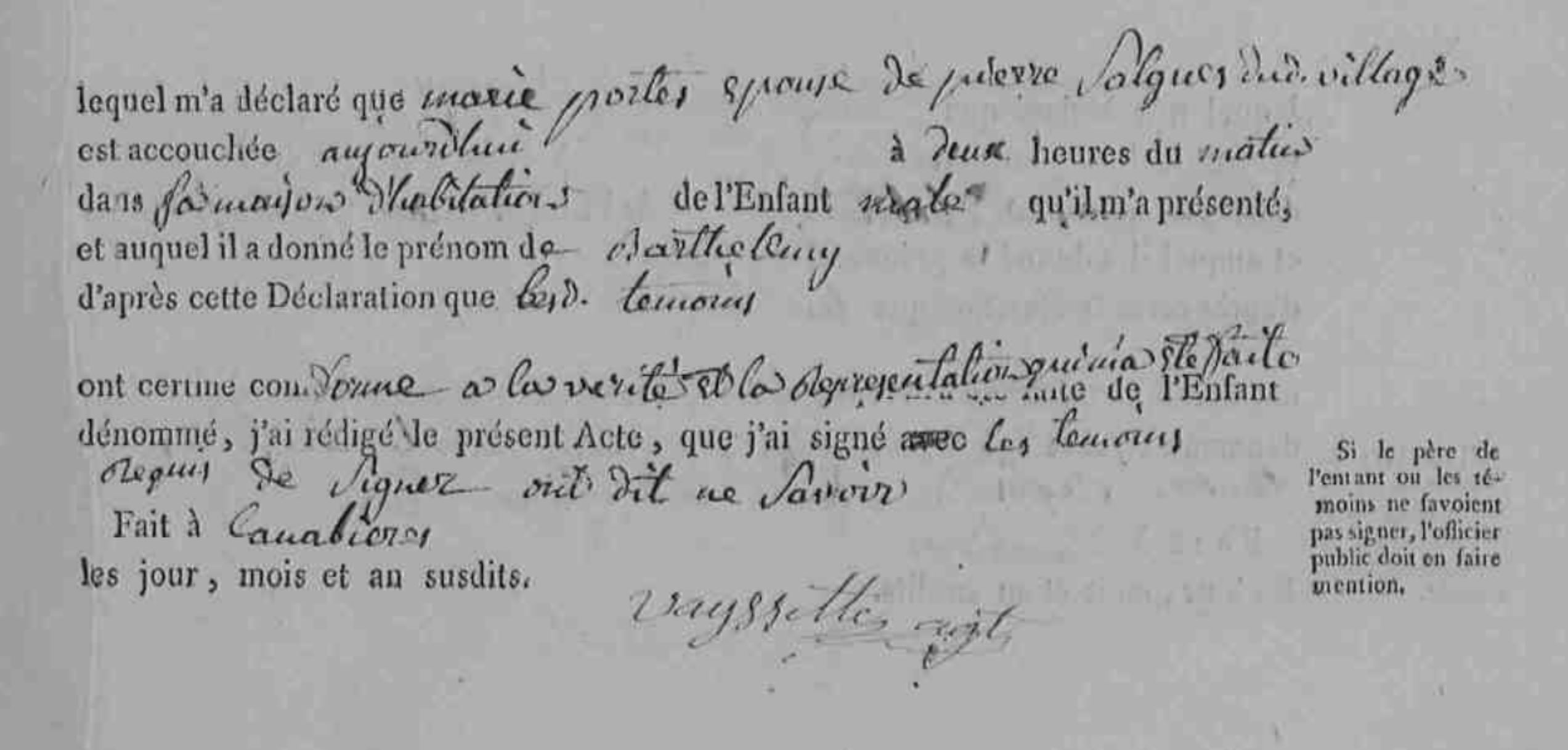 | Notes | Date de naissance indiquée dans son acte de mariage avec Marianne Vaissière Date du décès indiquée dans l'acte de mariage de son fils Barthélémy Agé de 35 ans à la naissance de son fils Barthélémy |