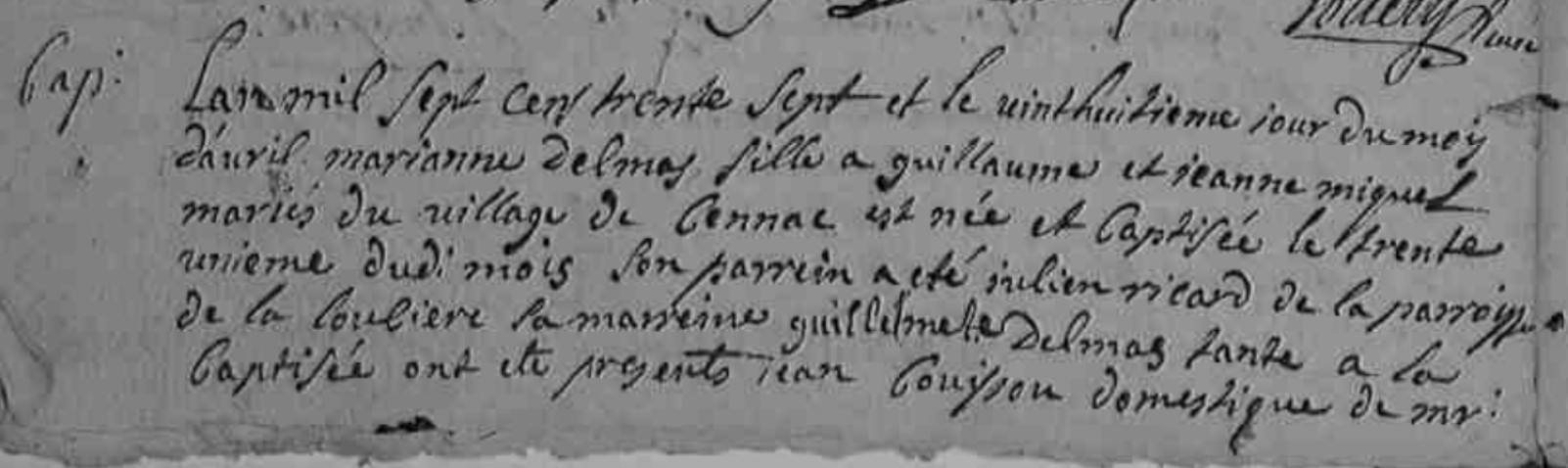 | Prénom | Marianne 'Marie' | | Nom de famille | Delmas | l'an mil sept cent trente sept et le vingt huitieme jour du moy d'avril Marianne Delmas fille légitime à Guillaume et Jeanne Miquel mariés du village de Bennac est née et baptisée le trente unieme dudi mois son parrain a été Julien Ricard de la parroisse de la Loubiere, sa marraine Guillemette Delmas tante à la baptiséee ont été présents Jean Bouyssou domestique de mr le curé soussigné Jean Innelles et Antoine Austry qui requis de signer ont dit ne seavoir | Naissance (plus...) | 28 avril 1737 | Montrozier, Aveyron, FRANCE (Bennac Gages, Montrozier, 12157, Aveyron, Occitanie, France) | | Baptême | 30 avril 1737 | Montrozier, Aveyron, FRANCE (, Montrozier, 12157, Aveyron, Occitanie, France) | Témoins au Bapteme/Naissance | Parrain Julien Ricard Tante Guillemette Delmas Témoin Jean Bouyssou Témoin Jean Innelles Témoin Antoine Austry