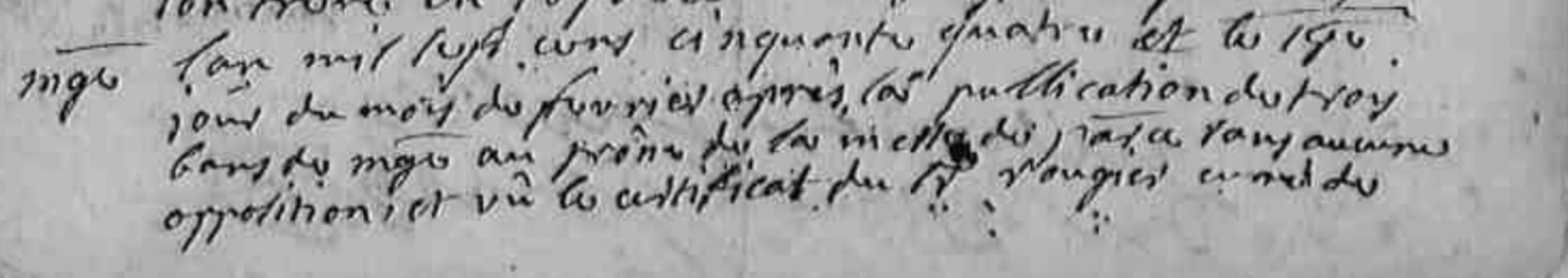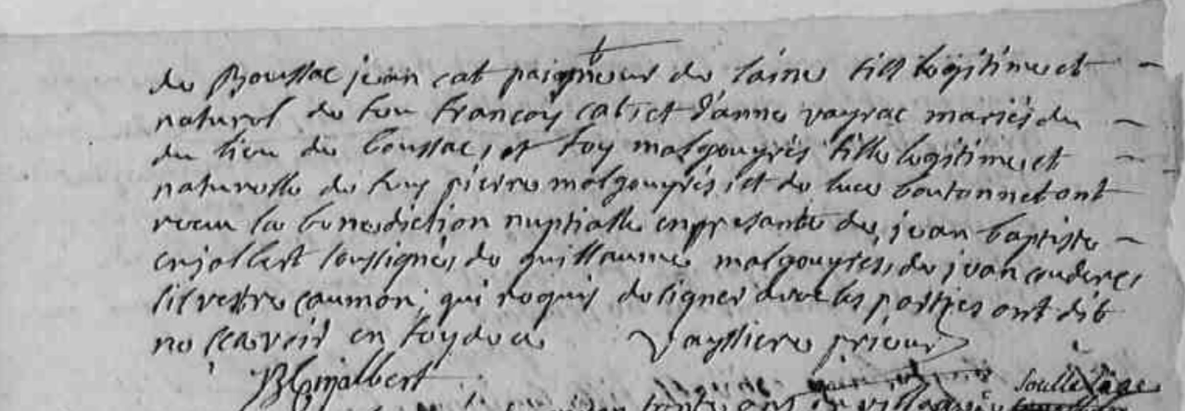L'an mil sept cent cinquante quatre et le 18ème jour du mois de février après les publications ... Jean Cat ... fils légitime et naturel de feu François Cat et d'Anne Vayrac mariés du lieu de Boussac et Foy Malgouyres fille légititme et naturelle de feu Pierre Malgouyres et de ... Boutonnet ont reçu la bénédiction nuptiale en présence de Jean Baptiste Enjalbert soussigné de Guillaume Malgouyres de Jean Coudrec, Silvestre Caumon qui requis de signeravec les parties ont dit ne savoir