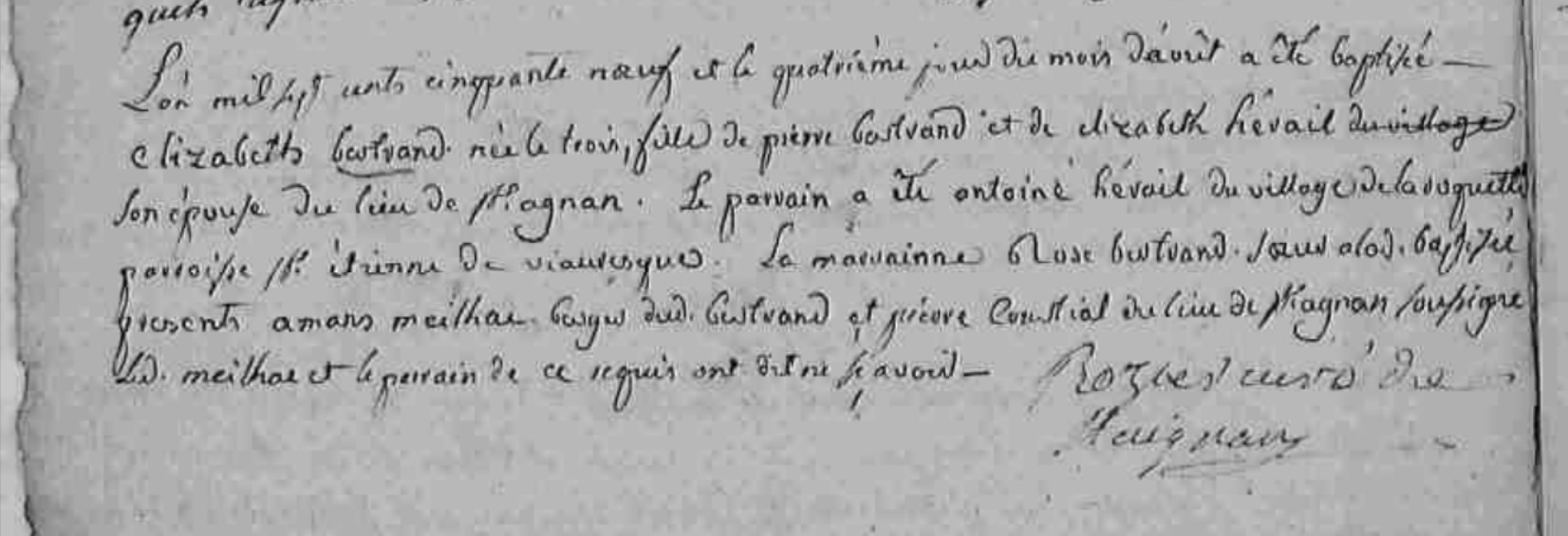 | Prénom | Elisabeth | | Nom de famille | Bertrand | L'an mil sept cents cinquante neuf et le quatrième jour du mois d'août a été baptisée Elisabeth Bertrand née le trois, fille de Pierre Bertrand et de Elisabeth Hérail son épouse du lieu de St Agnan. Le parrain a été Antoine Hérail du village de la Saguette parroisse St Etienne de Viauresque. La marraine Rose Bertrand soeur de la baptisée présents Amans Meilhac berger dud. Bertrand et Pierre Courtian du lieu de St Agnan soussigné led. Meilhac et le parrain de ce requis ont dit ne le savoir | Naissance (plus...) | 3 août 1759 | Ségur, Aveyron, FRANCE (, Ségur, 12266, Aveyron, Occitanie, France) | | Baptême | 4 août 1759 | Ségur, Aveyron, FRANCE (, Ségur, 12266, Aveyron, Occitanie, France) | Témoins au Bapteme/Naissance | Parrain Antoine Herail Soeur Rose Bertrand Témoin Amans Meihac Témoin Pierre Courtial