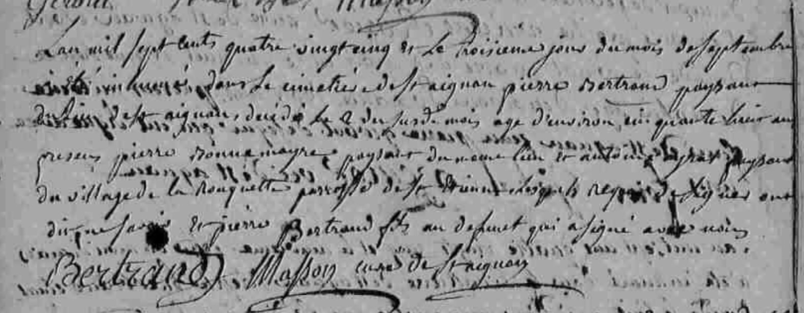 | l'an mil sept cents quatre vingt cinq et le troisieme jour du mois de septembre a été inhumé dans le cimetiere de St Aignan Pierre Bertrand paysan du lieu de St Aignan, décédé le 2 du .. mois âgé d'environ cinquante huit ans présens Pierre Bonnemayre, paysan du même lieu et Antoine ..yrat paysan du village de la Rouquette paroisse de St Etienne lesquels requis de signer ont dit par savoir et Pierre Bertrand fils au défunt qui a signé avec nous | Décès (plus...) | 2 septembre 1785 à l'âge de 58 ans | Ségur, Aveyron, FRANCE (Saint-Agnan Lacombe, Ségur, 12266, Aveyron, Occitanie, France) | Témoins Décès | Témoin Pierre Bertrand