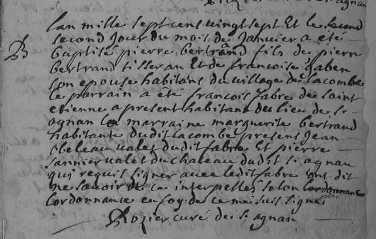 | Prénom | Pierre | | Nom de famille | Bertrand | | Profession | Paysan | l'an mille sept cens vingt sept et le second second jour du mois de janvier a été baptisé Pierre Bertrand fils de PIerre Bertrand tisserand et de Françoise Gaben son épouse habitans du village de Lacombe le parrain a été François Favre de Saint Agnan, la marraine Marguerite Bertrand habitante dudit Lacombe présens Jean Obeleau valet dudit Fabre et PIerre Sannier valet du chateau dudit St Agnan qui requis signer avec le dit Fabre ont dit ne savoir de ce interpellés selon l'ordonnance en foy de ce ... suit signer | Naissance (plus...) | 2 janvier 1727 | Ségur, Aveyron, FRANCE (Saint-Agnan Lacombe, Ségur, 12266, Aveyron, Occitanie, France) | | Baptême | 2 janvier 1727 | Ségur, Aveyron, FRANCE (, Ségur, 12266, Aveyron, Occitanie, France) | Témoins au Bapteme/Naissance | Marraine Marguerite Bertrand Parrain François Fabre Témoin Jean Obeleau Témoin Pierre Sannier