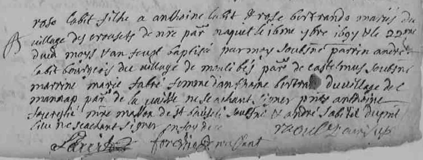 | Prénom | Rose | | Nom de famille | Labit | Rose Labit fille à Anthoine Labit et Rose Bertrand marié du village des crousets de ... par... naquit le 16e 7bre 1697 et le 22e dudu moys ... feut baptisée mar moy soussigné parrain André Labit du village de Monlies par. de Castelmus .... marrine Marie Fabré femme d'Anthoine Bertrand du village de Mannap par. de la Vaisse ne scachant signet. Présents Anthoine Sourghe ... ... de St ... ... & andré Sab... ... ne sachant signer | Naissance (plus...) | 16 septembre 1697 | Ségur, Aveyron, FRANCE (, Saint Etienne de Viauresque, 12266, Aveyron, Occitanie, France) | | Baptême | 22 septembre 1697 | Ségur, Aveyron, FRANCE (, Saint Etienne de Viauresque, 12266, Aveyron, Occitanie, France) | Témoins au Bapteme/Naissance | Parrain André Labit Marraine Marie Fabré