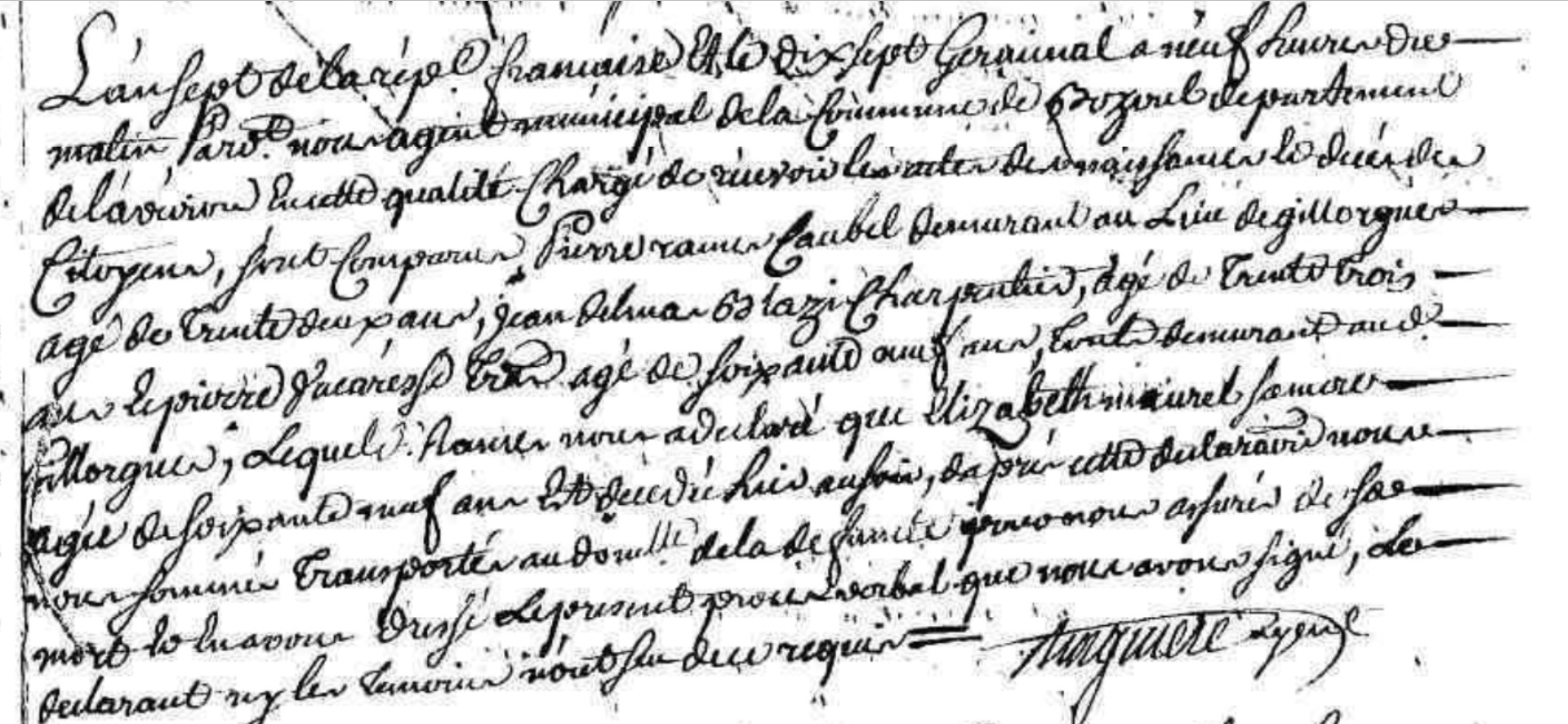 | l'an sept de la rep. française et le dix sept germinal à neuf heure du matin, pardevant nous agent municipal de la commune de Bozouls département de l'Aveiron en cette qualité chargé de recevoir les actes de naissance, de décès des citoyens, sont comparus Pierre Rames ..aubel demeurant au lieu de Gillorgues âgé de trente deux ans, Jean Delma .... charpentier âgé de trente trois ans, de Pierre Vacarés ... âgé de soixante ans ... tous demeurant audit Gillorgues, lequel Rames nous a déclaré que Elisabeth Maurel sa mère âgée de soixante neuf ans est decedée hier .... .... cette déclaration nous nous sommes transporté au domicile de la défunte pour nous assurés de sa mort et ... avons dressé le présent procès verbal que nous avons signé, le déclarant ny les témoins nont su de ce requis | Décès (plus...) | 6 avril 1799 à l'âge de 68 ans | Bozouls, Aveyron, FRANCE (, Bozouls, 12033, Aveyron, Occitanie, France) |