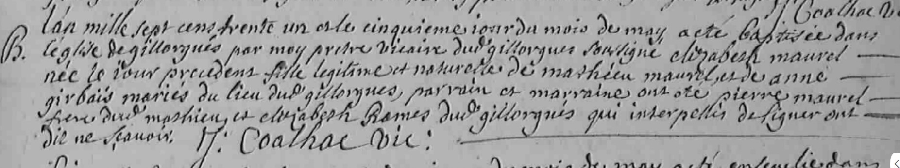 | Prénom | Elizabeth | | Nom de famille | Maurel | L'an mille sept cens trente un esle cinquieme jour du mois de may, a été baptsée dans l'église de Gillorgues par moy prêtre vicaire dud. Gillorgues soussigné Elizabeth Maurel née le jour précédent fille légitime et naturelle de Mathieu Maurel et de Anne Girbais mariés du lieu dud. Gillorgues, parrain et marraine ont été Pierre Maurel frère dud. Mathieu et Elizabeth Rames dud. Gillorgues qui interpellés de signer ont dit ne savoir | Naissance (plus...) | 4 mai 1731 | Bozouls, Aveyron, FRANCE (Gillorgues, Bozouls, 12033, Aveyron, Occitanie, France) | | Baptême | 5 mai 1731 | Bozouls, Aveyron, FRANCE (, Bozouls, 12033, Aveyron, Occitanie, France) | Témoins au Bapteme/Naissance | Oncle PIerre Maurel Marraine Elizabeth Rames